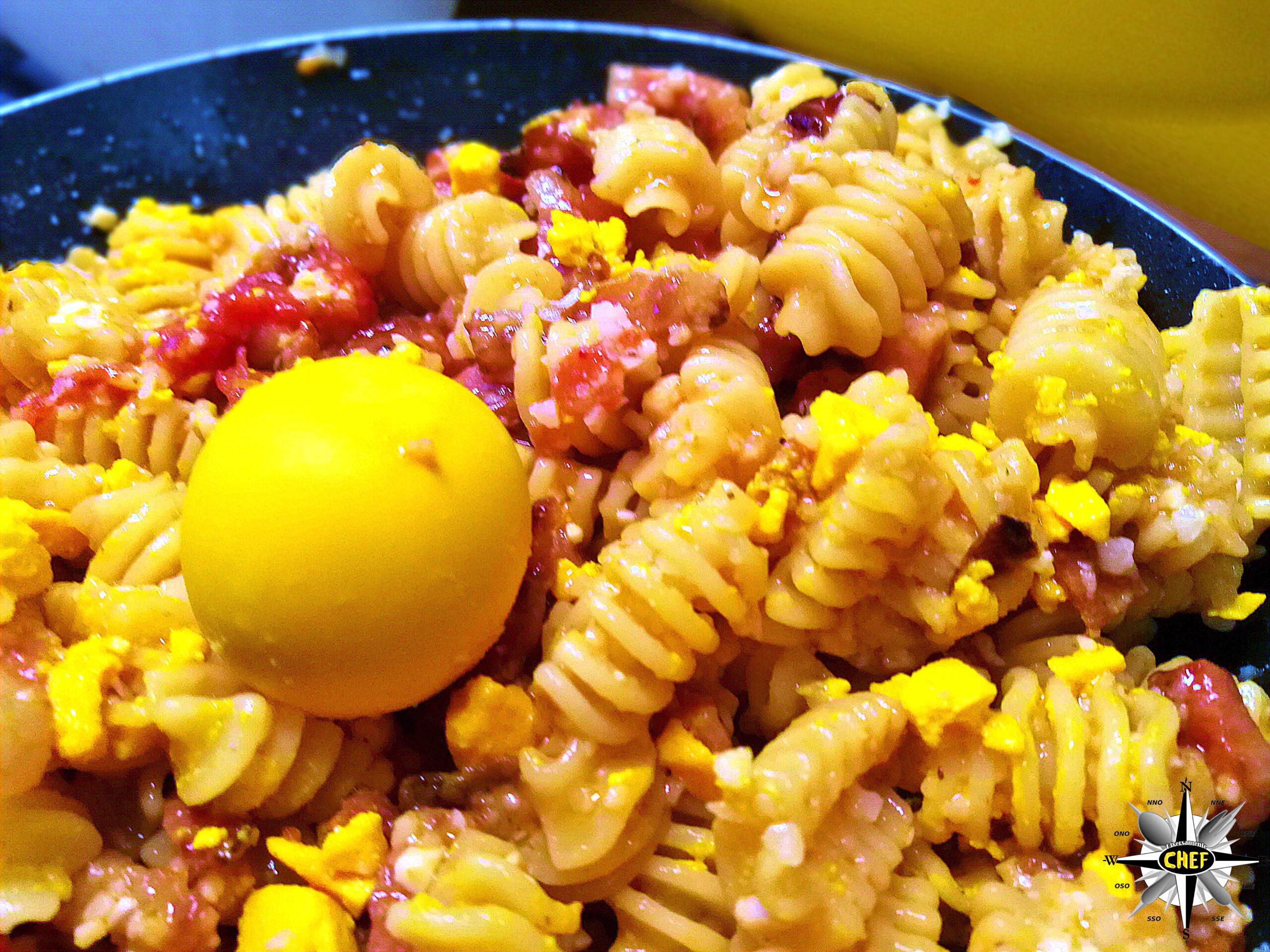 A cottura ultimata della pasta (7/8 min.), versare i radiatori nel guanciale aggiungendo pecorino, uova sode tritate e la salsa ottenuta miscelando il formaggio nell’olio di cottura del guanciale.