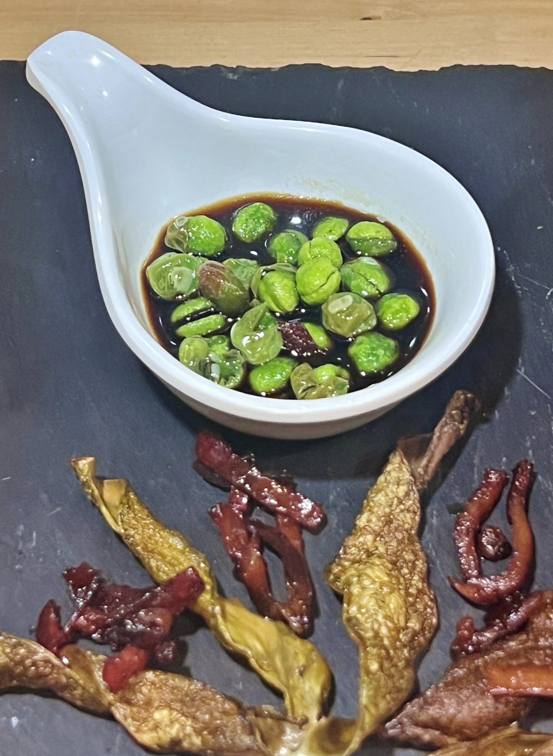 Utilizzando esclusivamente legumi freschi, abbiamo realizzato per il condimento una mousse di piselli, inserito alcuni piselli creudi, sottoposti a una leggera frittura, e dei baccelli decorati con speck affumicato.