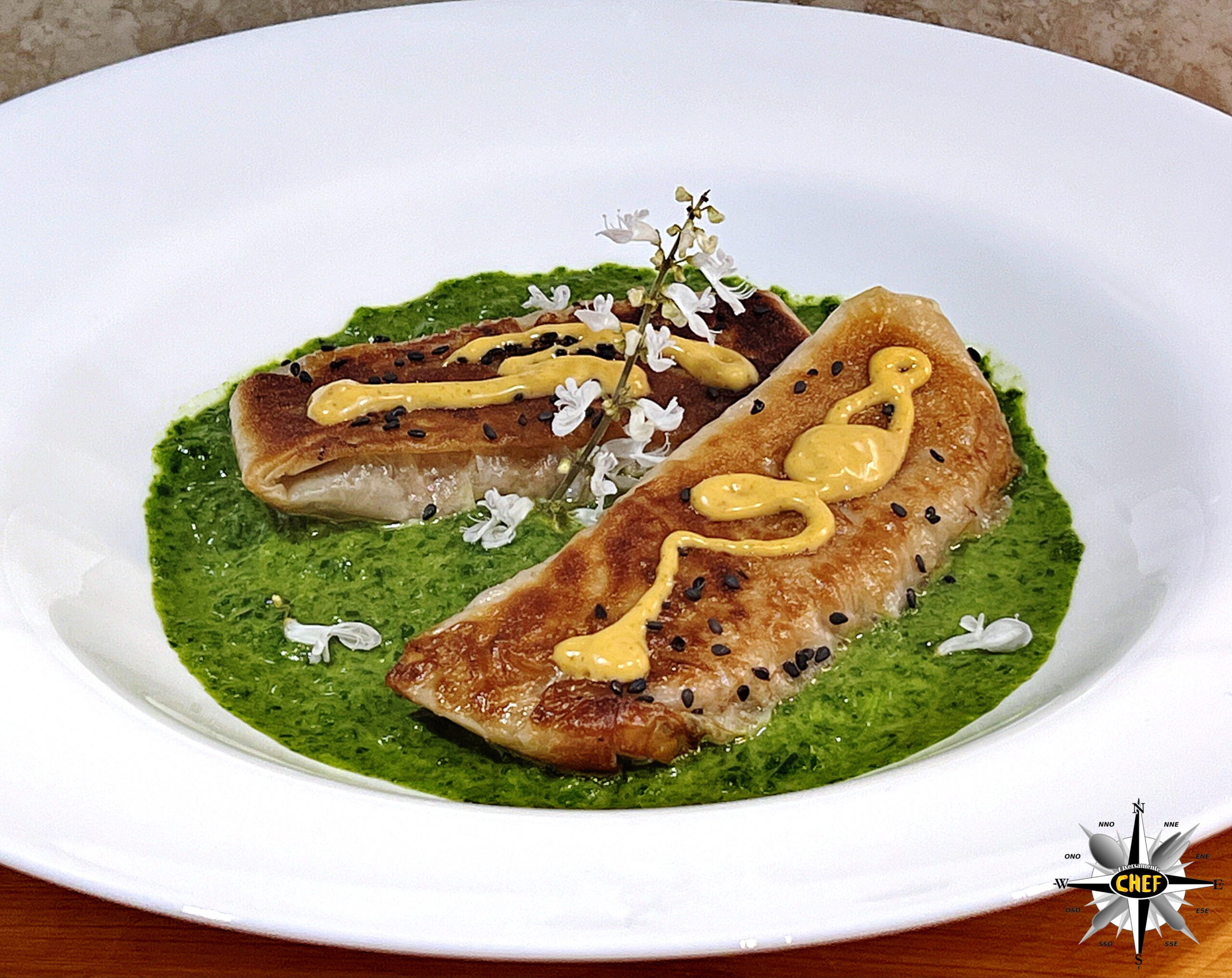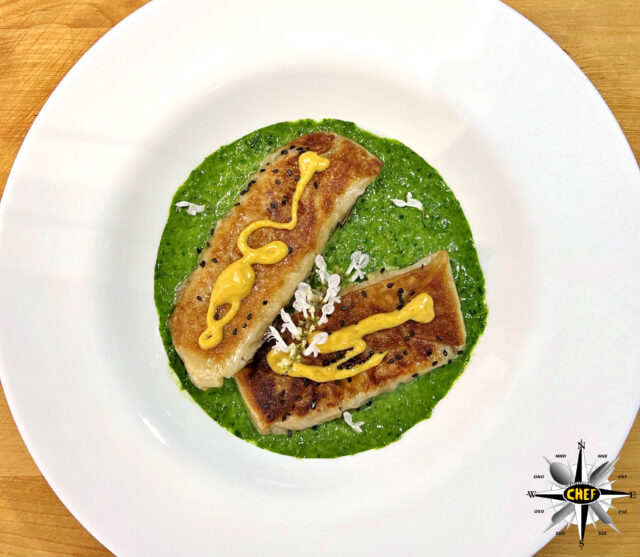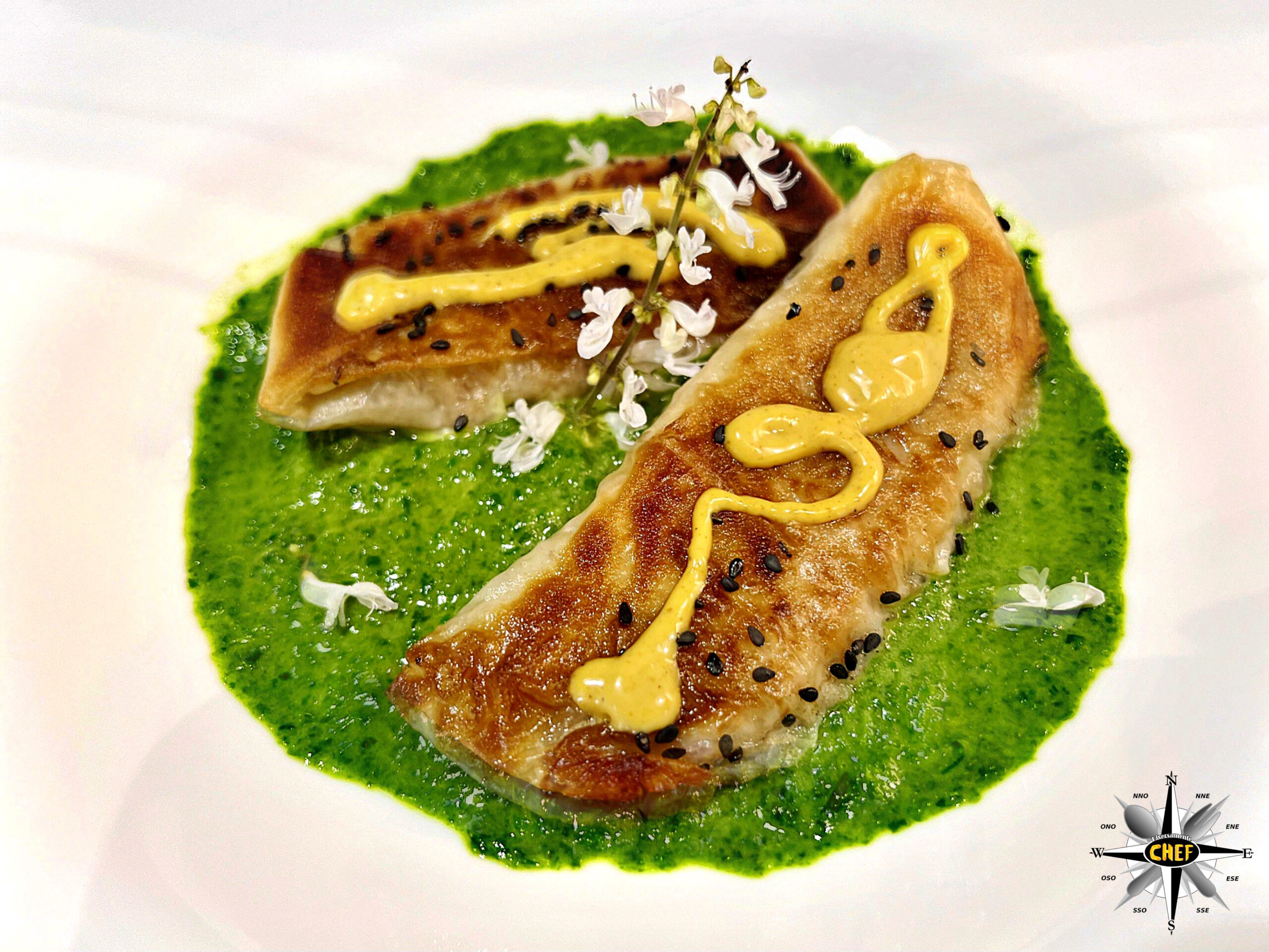Le verdure invece sono situate all’esterno degli involtini, trasformate per l’occasione in un appetitoso pesto di broccoli verdi dal quale spunta magicamente un rametto di fiori di incenso.