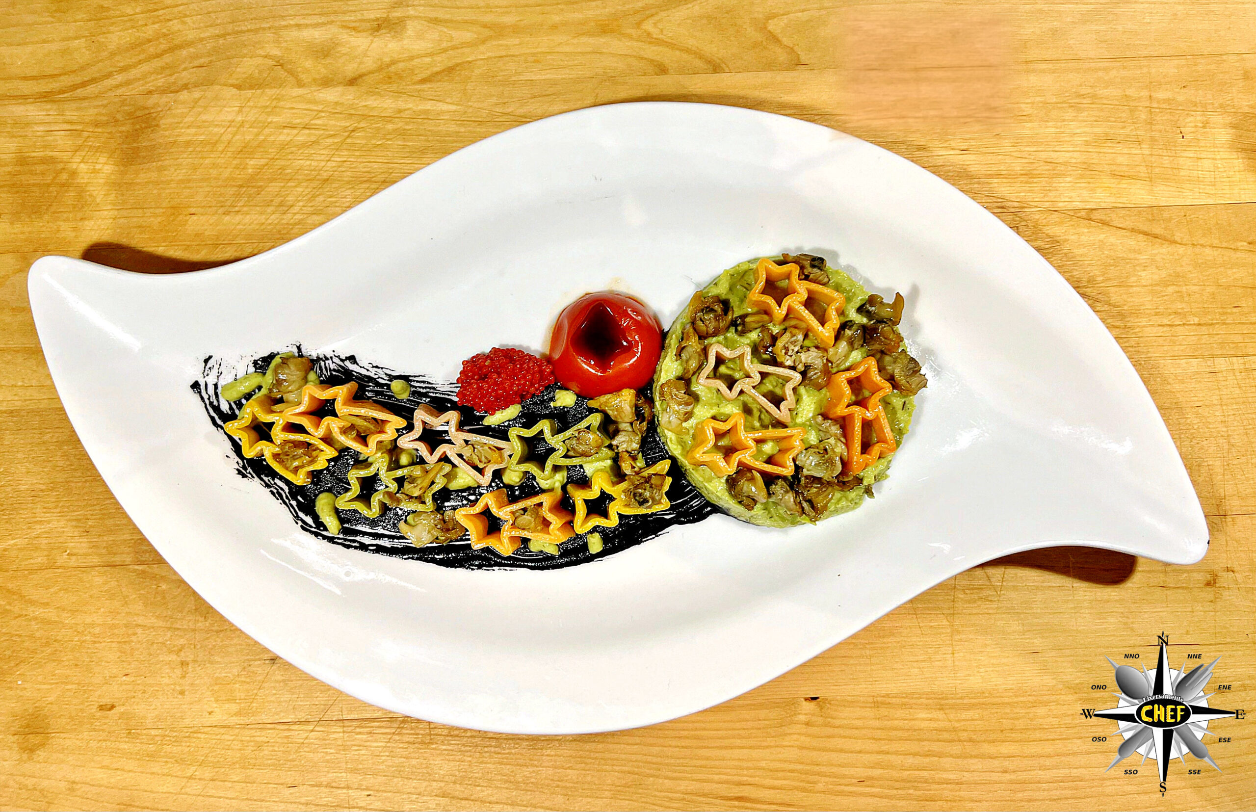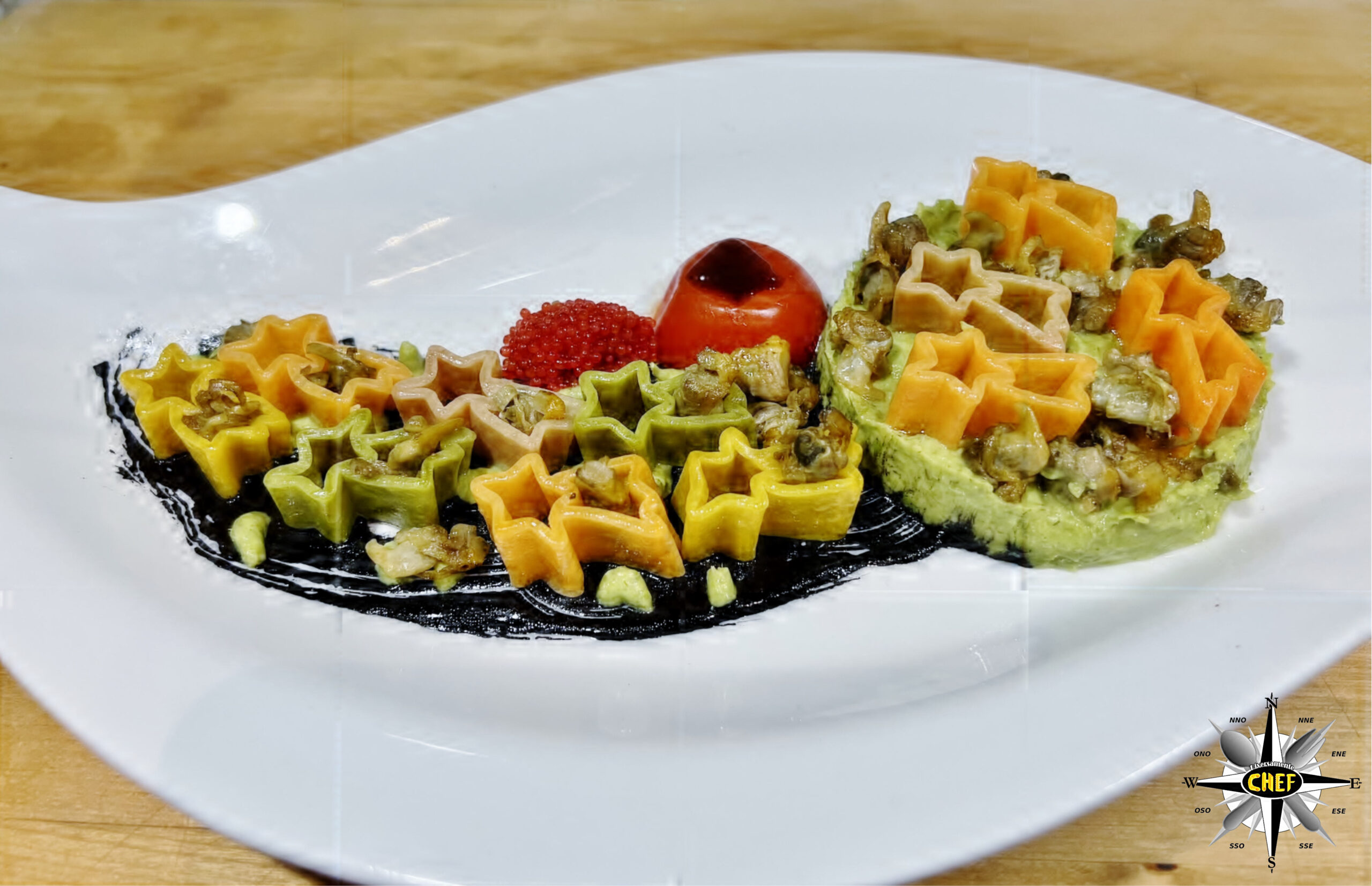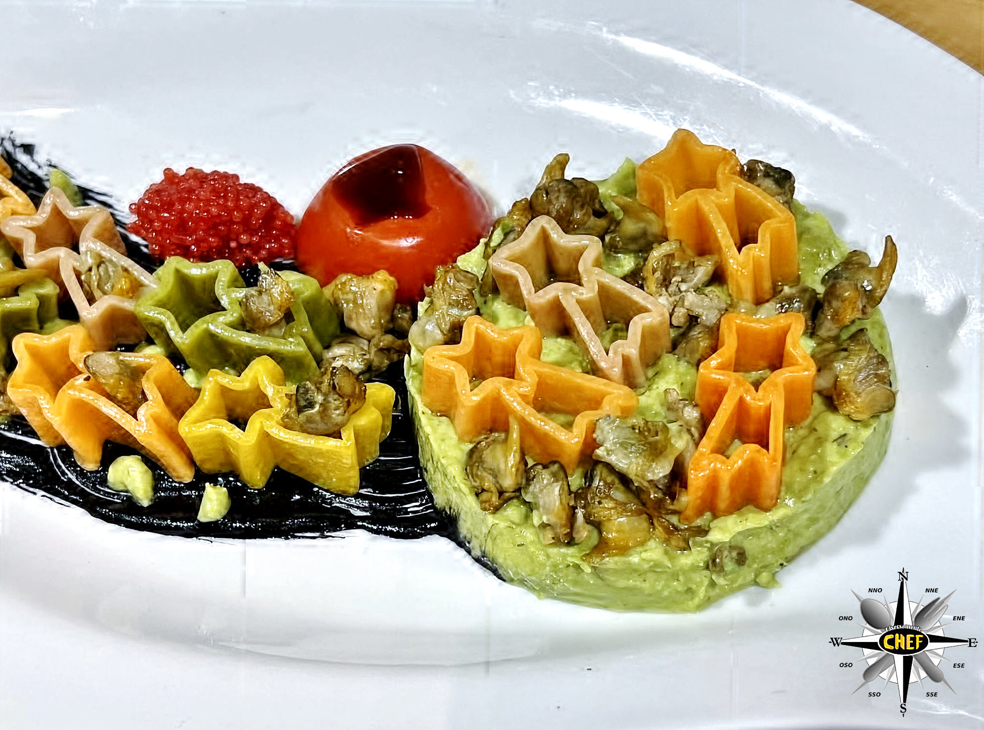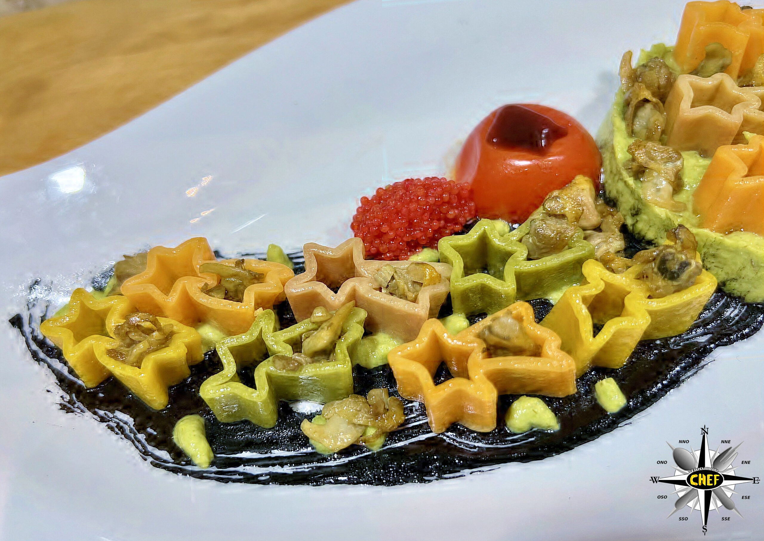 Inserire il pomodorino Pachino (leggermente sbollentato con la tecnica concassè) lungo il bordo superiore della cometa, affiancato da una quenelle di uova di capelin, e il piatto è pronto.