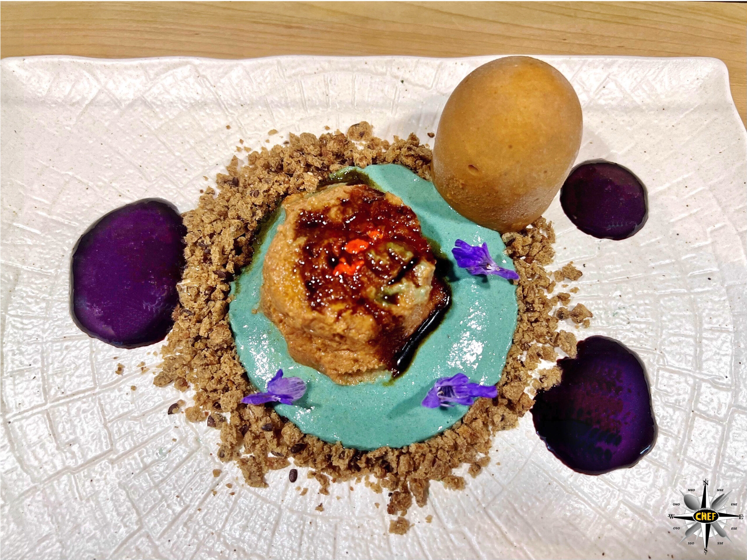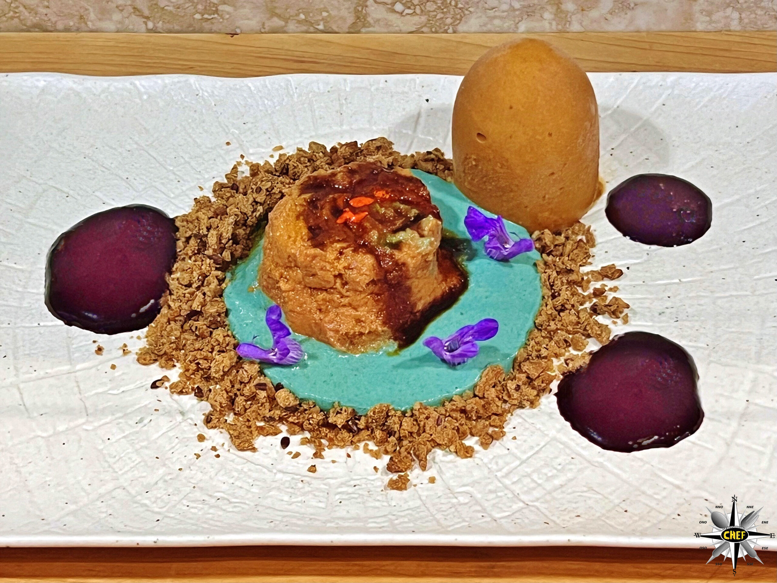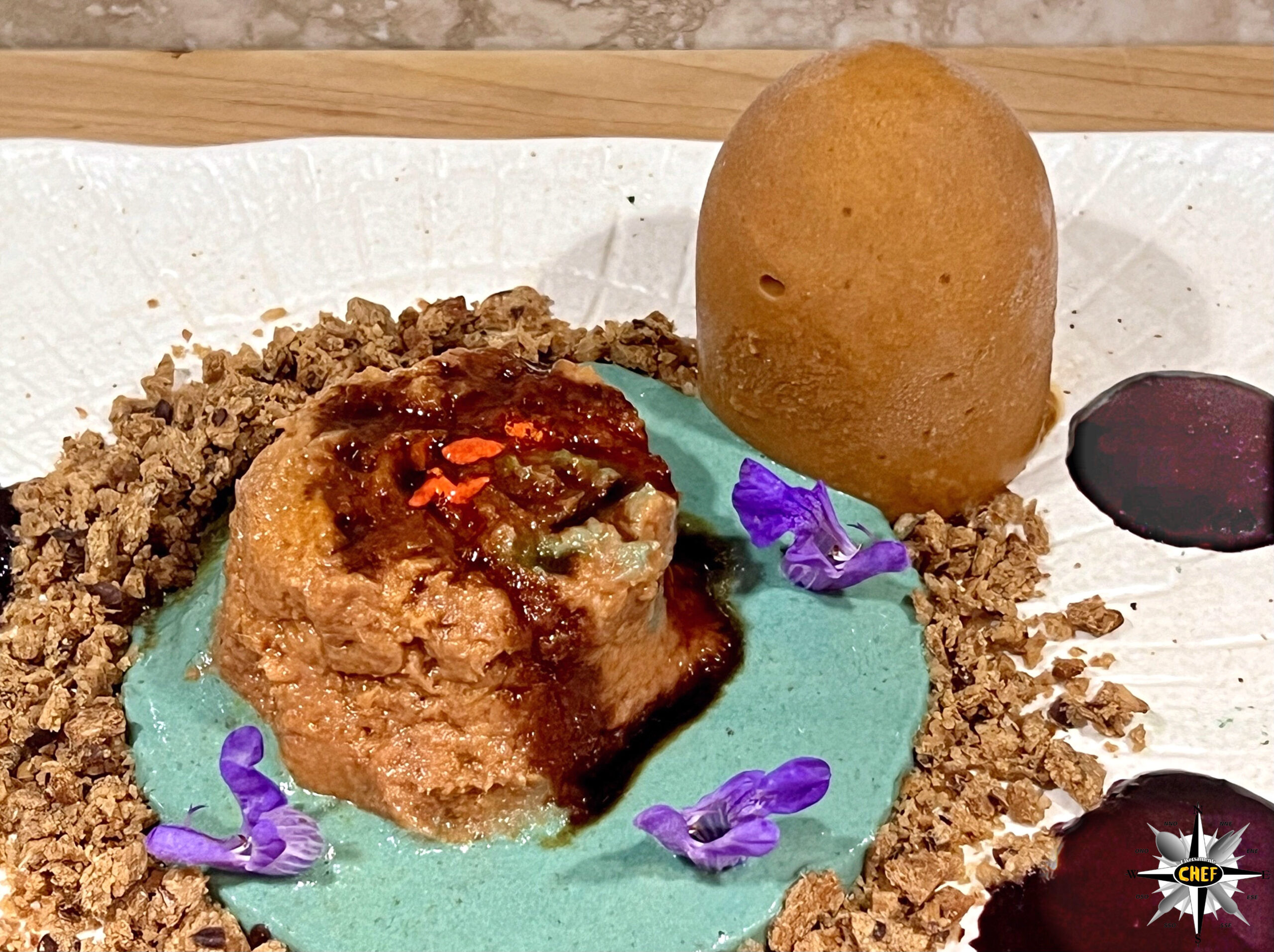 Per  il nostro “Stracotto di cervo con cremoso di fiori di salvia e coulis di mirtilli” abbiamo elaborato una nuova preparazione per la carne di cervo, abbastanza simile al goulash ma diversa per consistenza e texture, trasformata per l’occasione in una sorta di meat pie circondato da un crumble di carne.