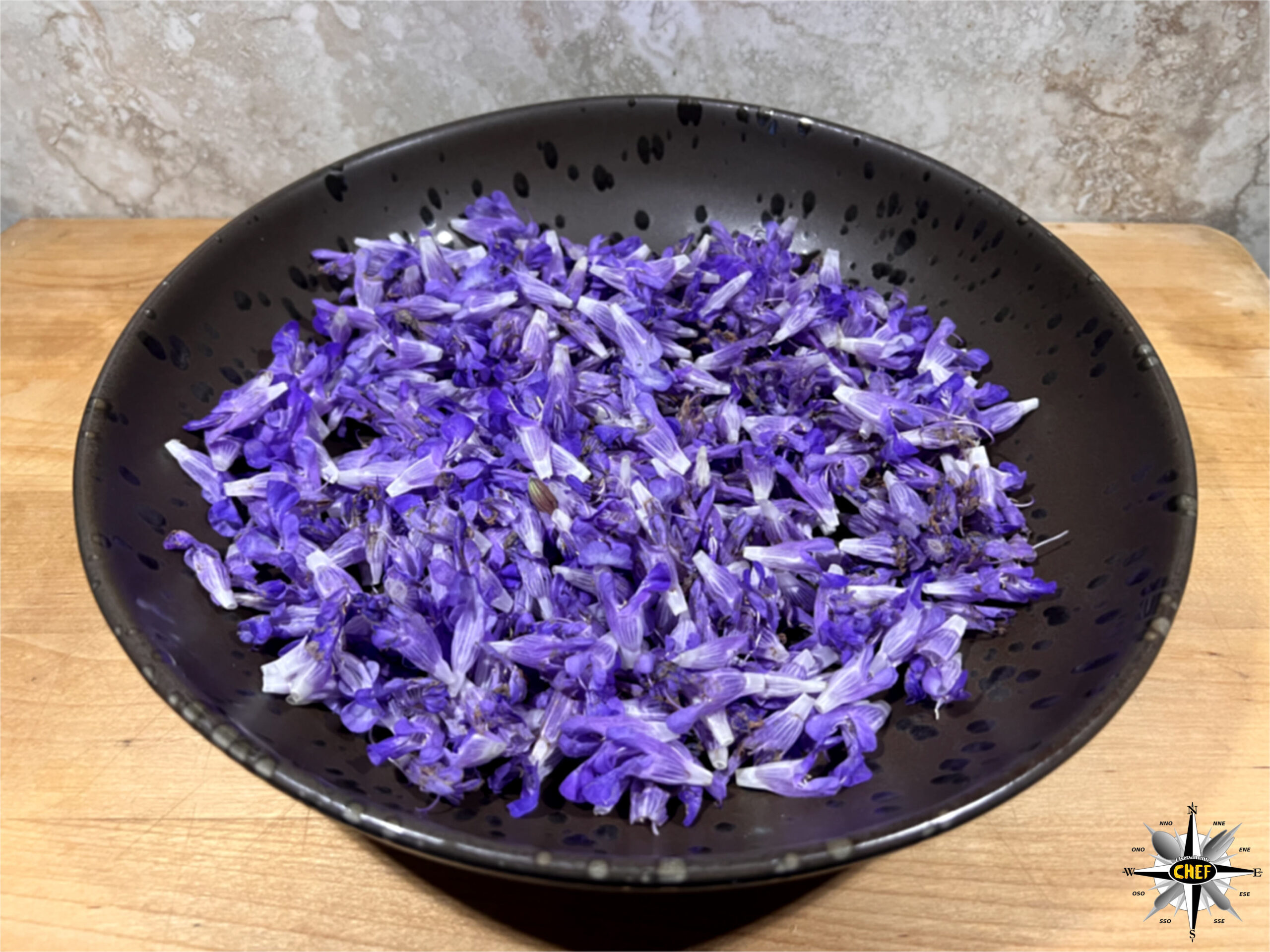 Lavare accuratamente i fiori di salvia, eliminando il cappuccio basale (verde) e asciugarli altrettanto bene prima con la centrifuga da insalata e poi con la carta assorbente da cucina.