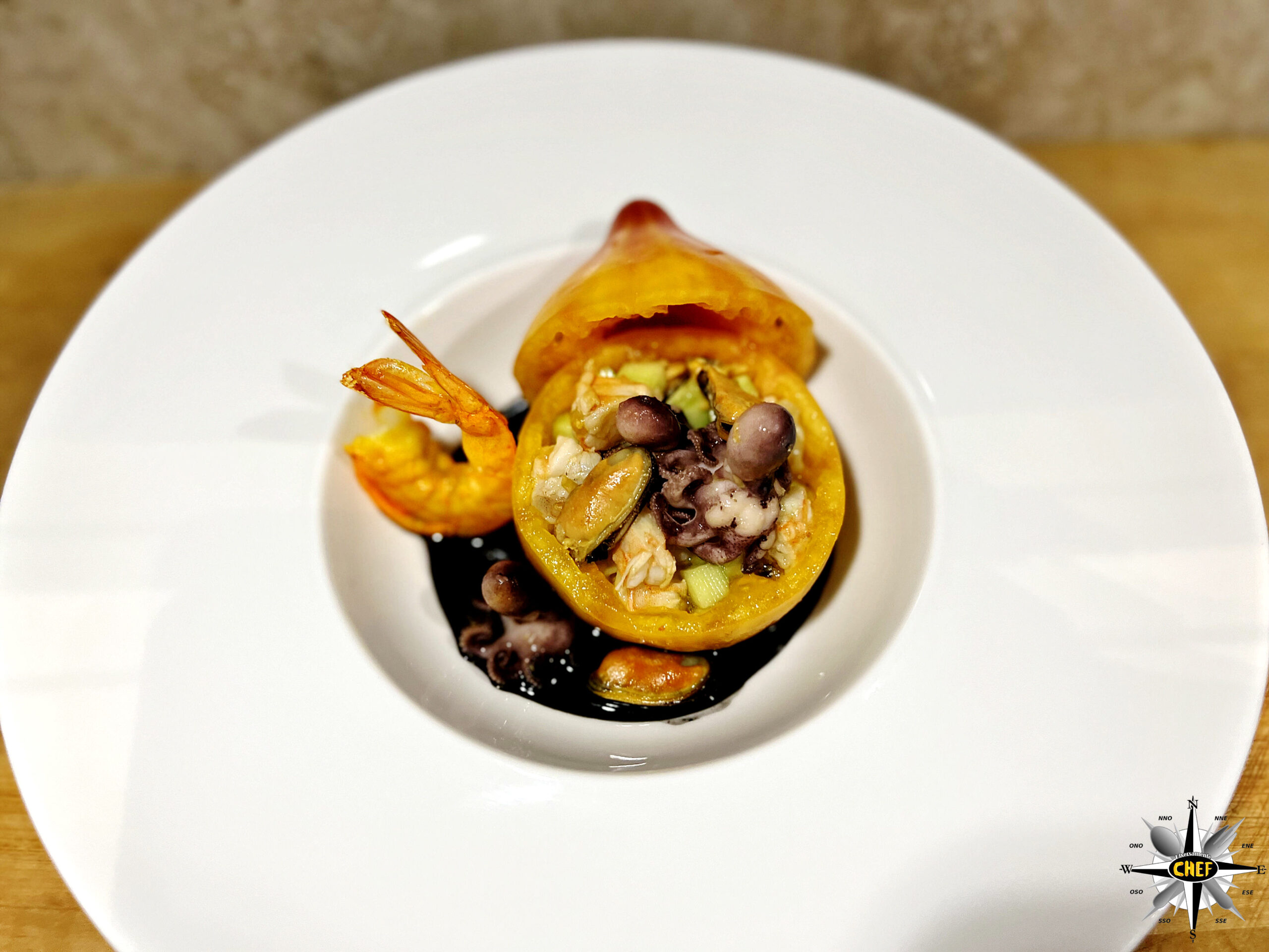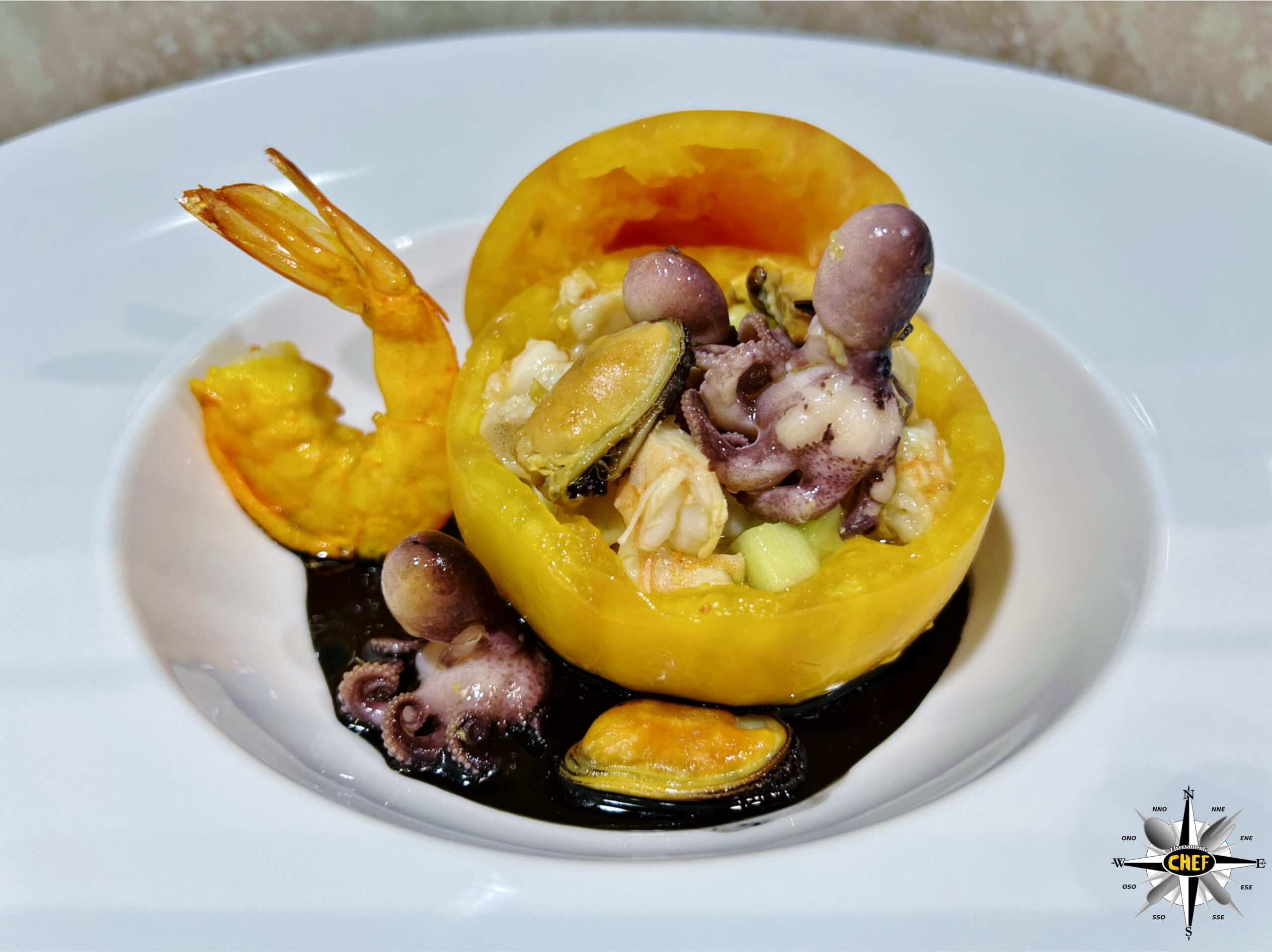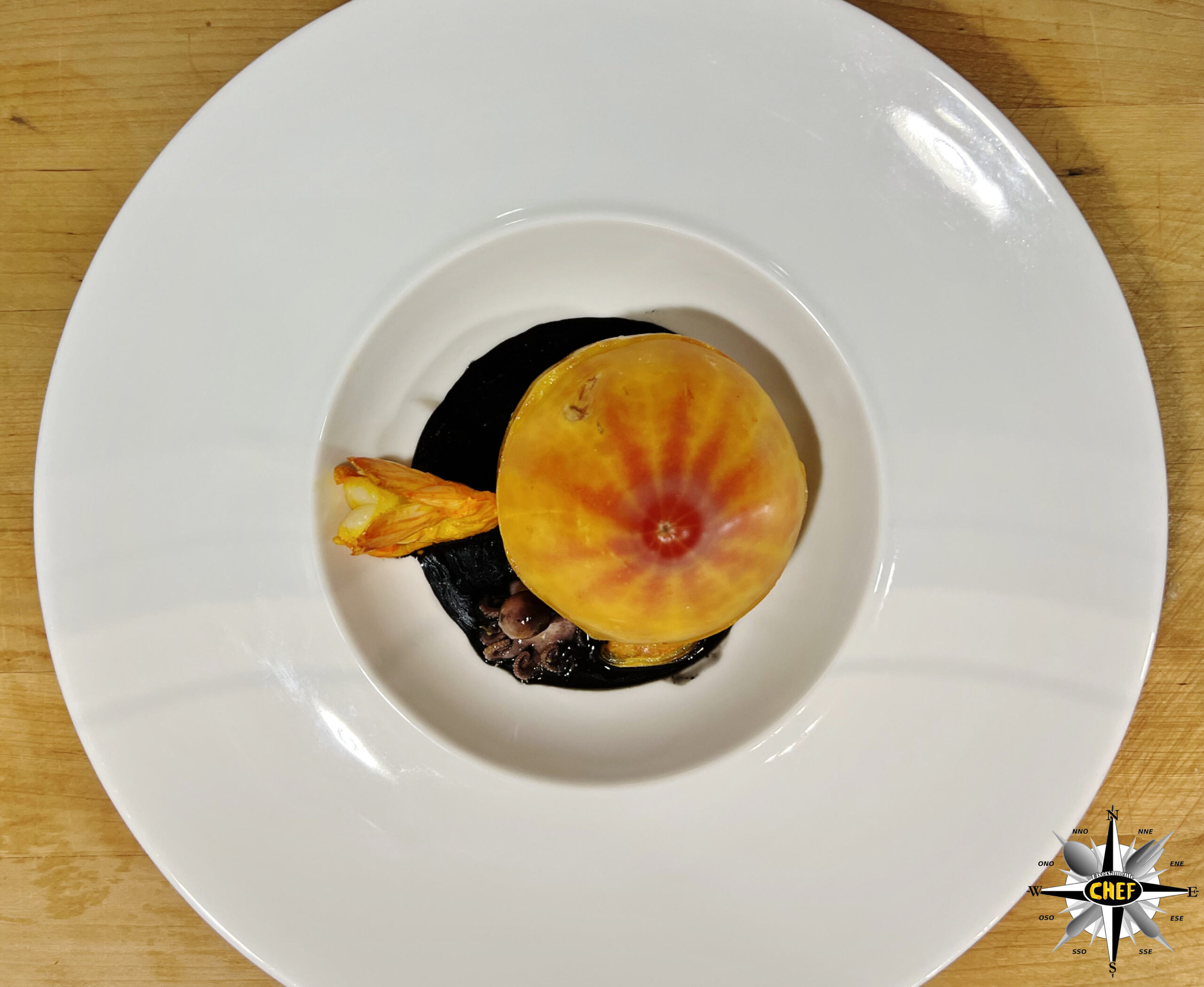 Per  la nostra “Summer Salad con mazzancolle, cozze, vongole e moscardini”  abbiamo scelto come contenitore dell’antipasto una singolare varietà di pomodoro, il  cœur de bœuf  francese.