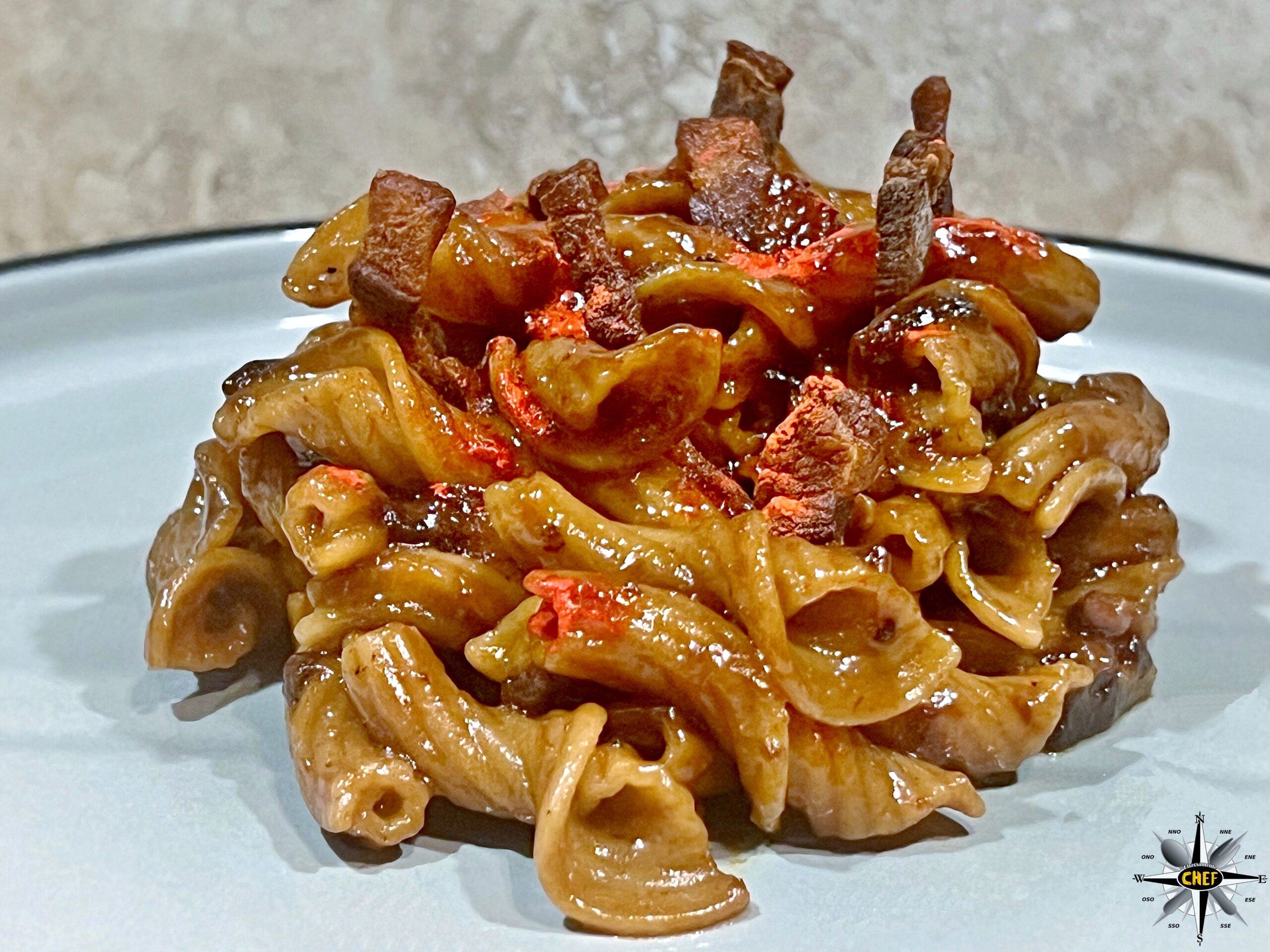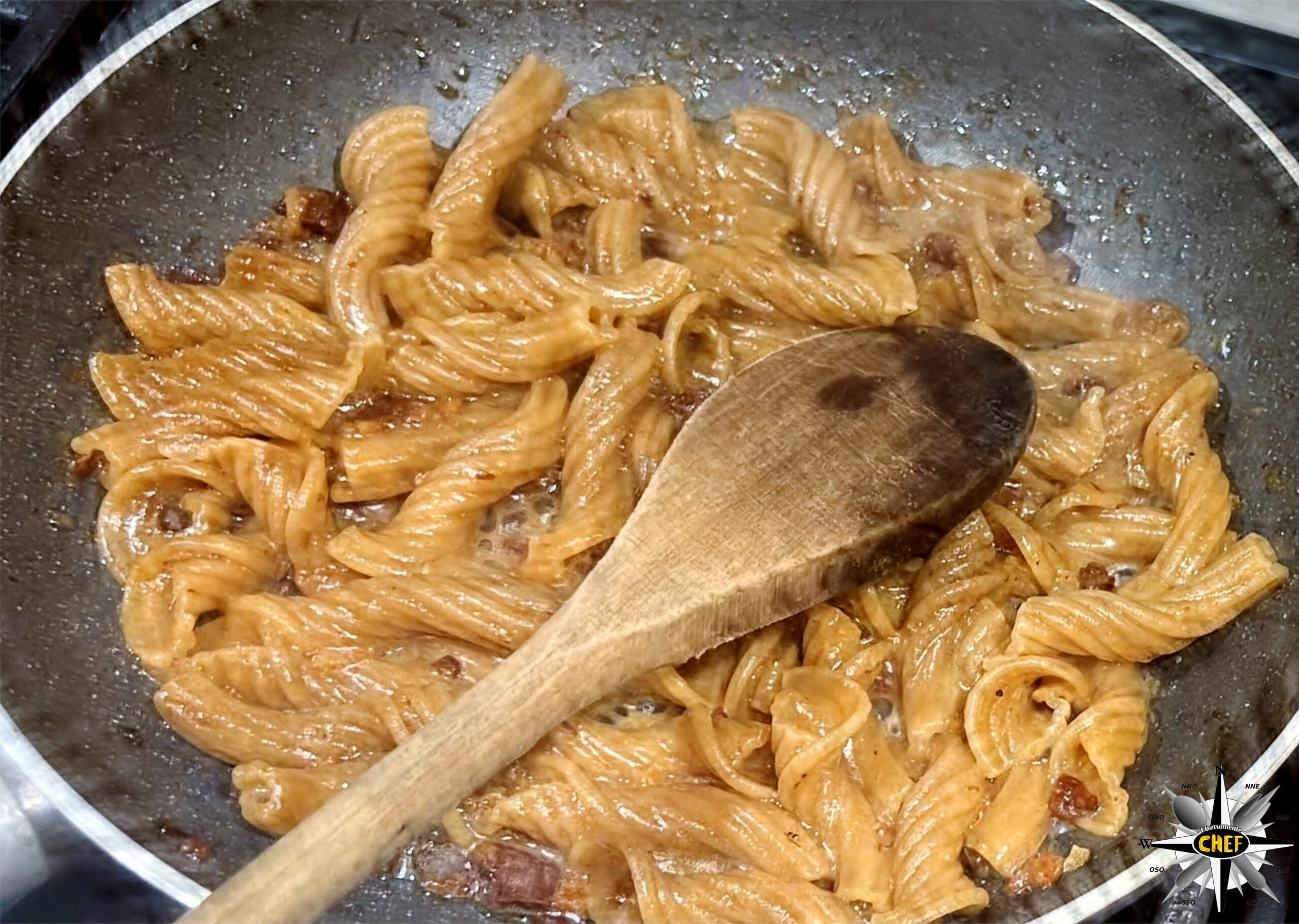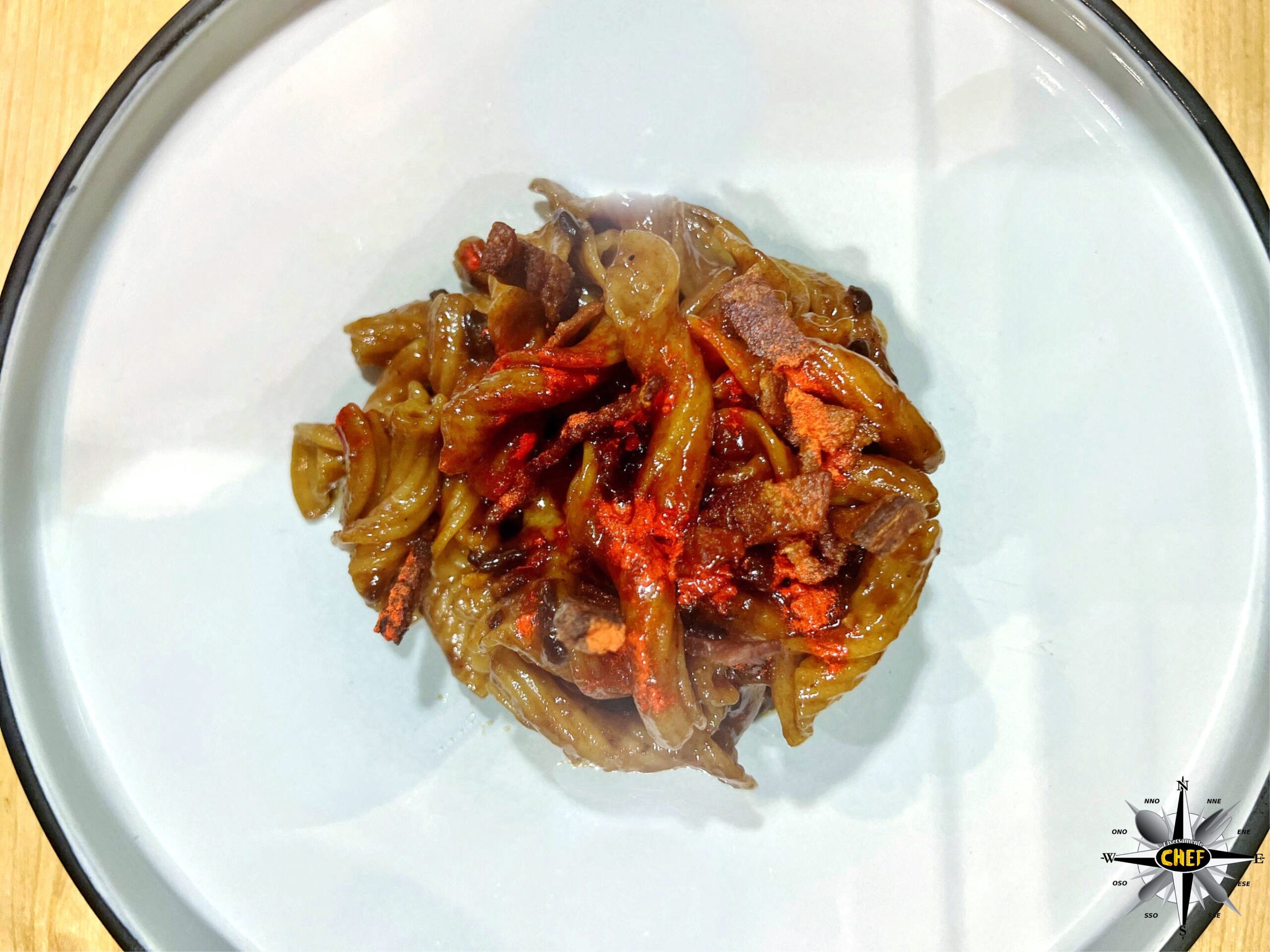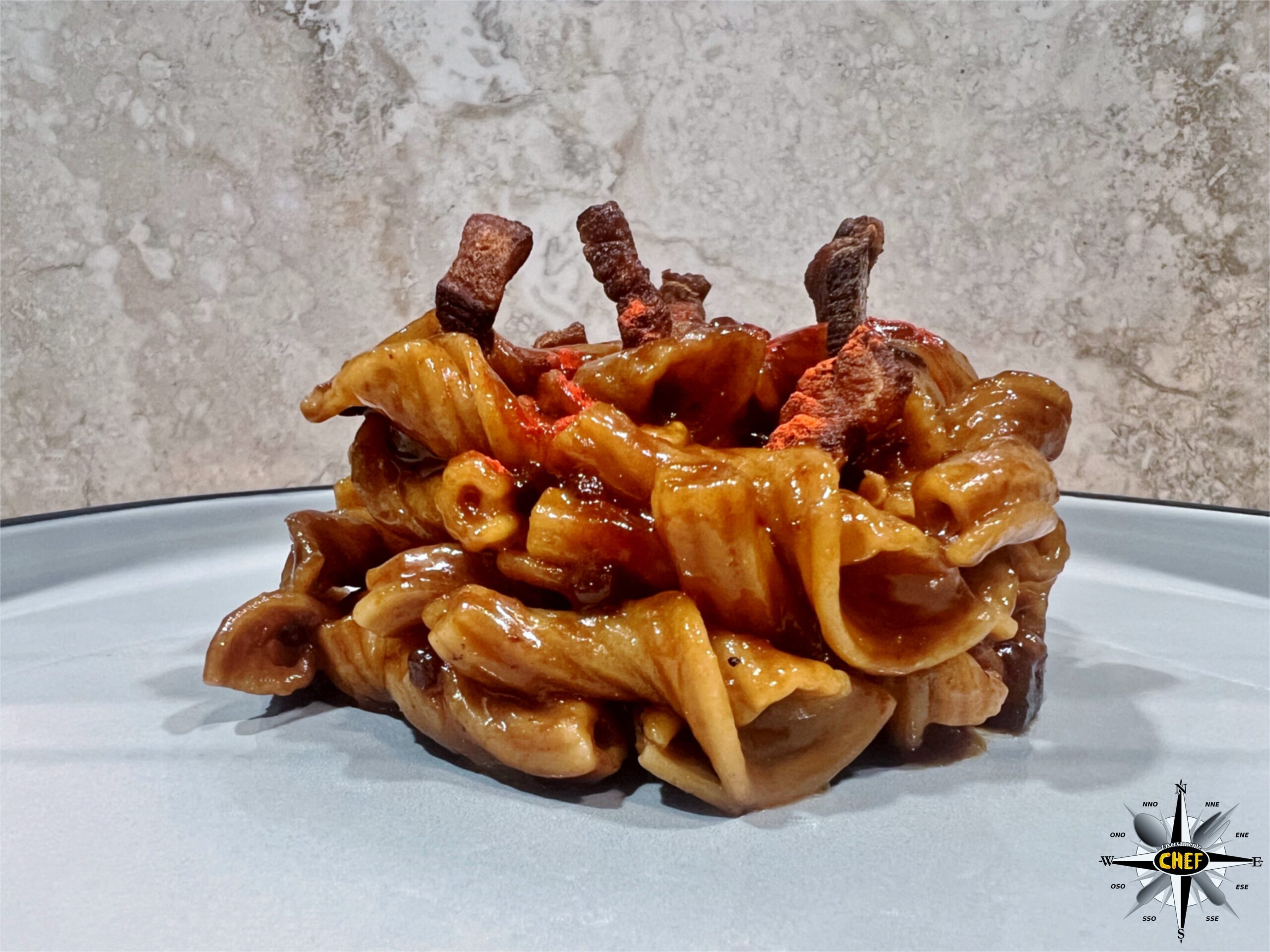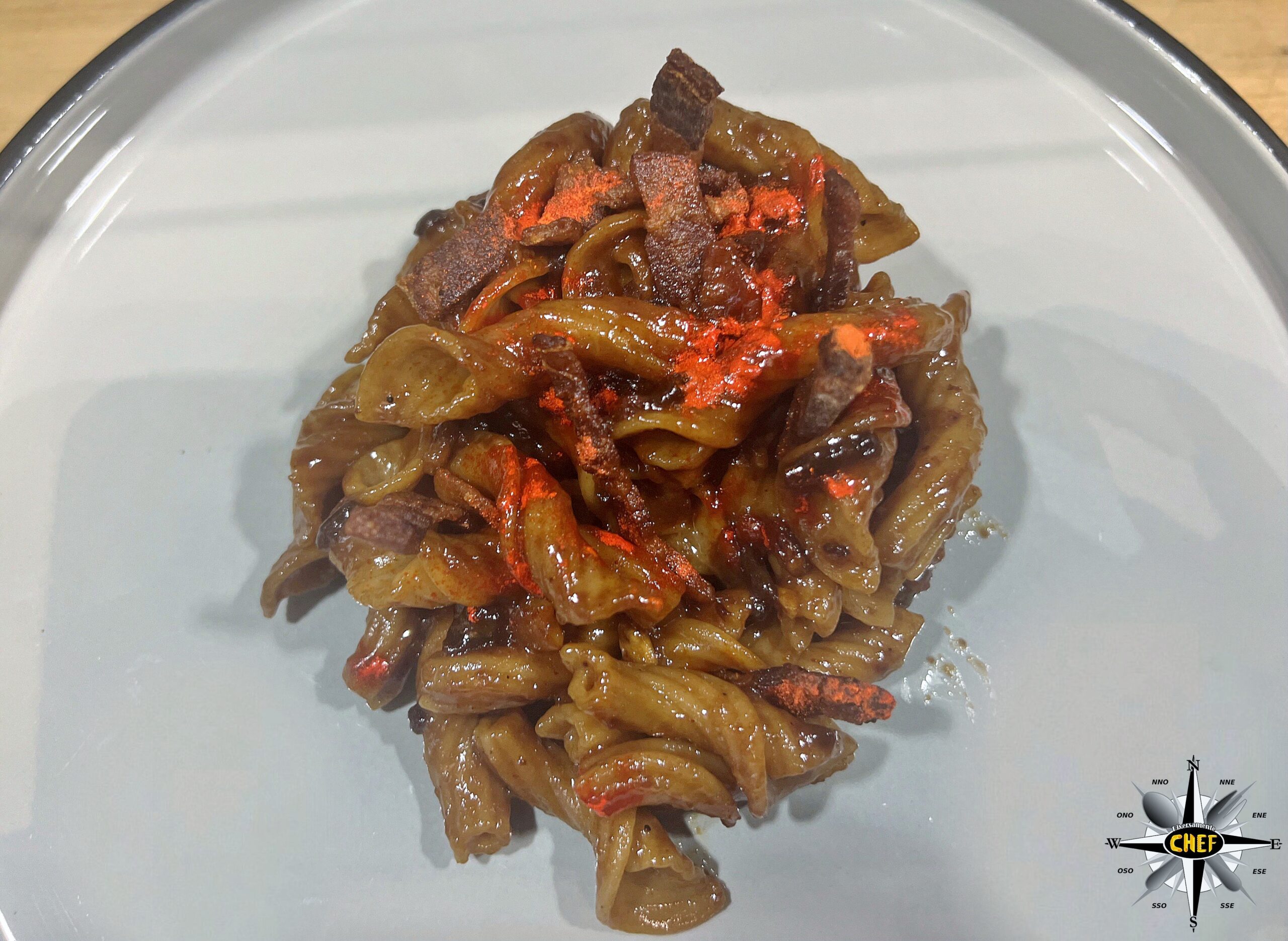 Una spruzzata di paprika rossa piccante, e i “Torchietti di farro in salsa di gorgonzola e liquirizia con guanciale croccante” sono pronti.