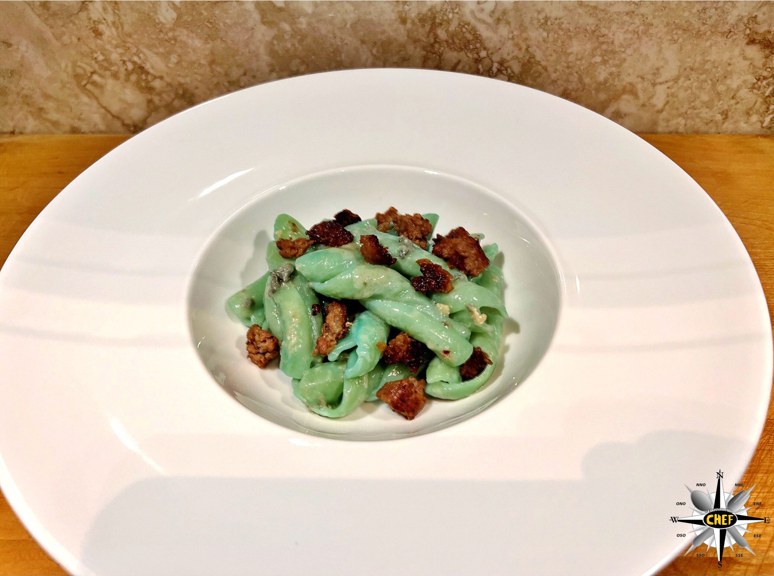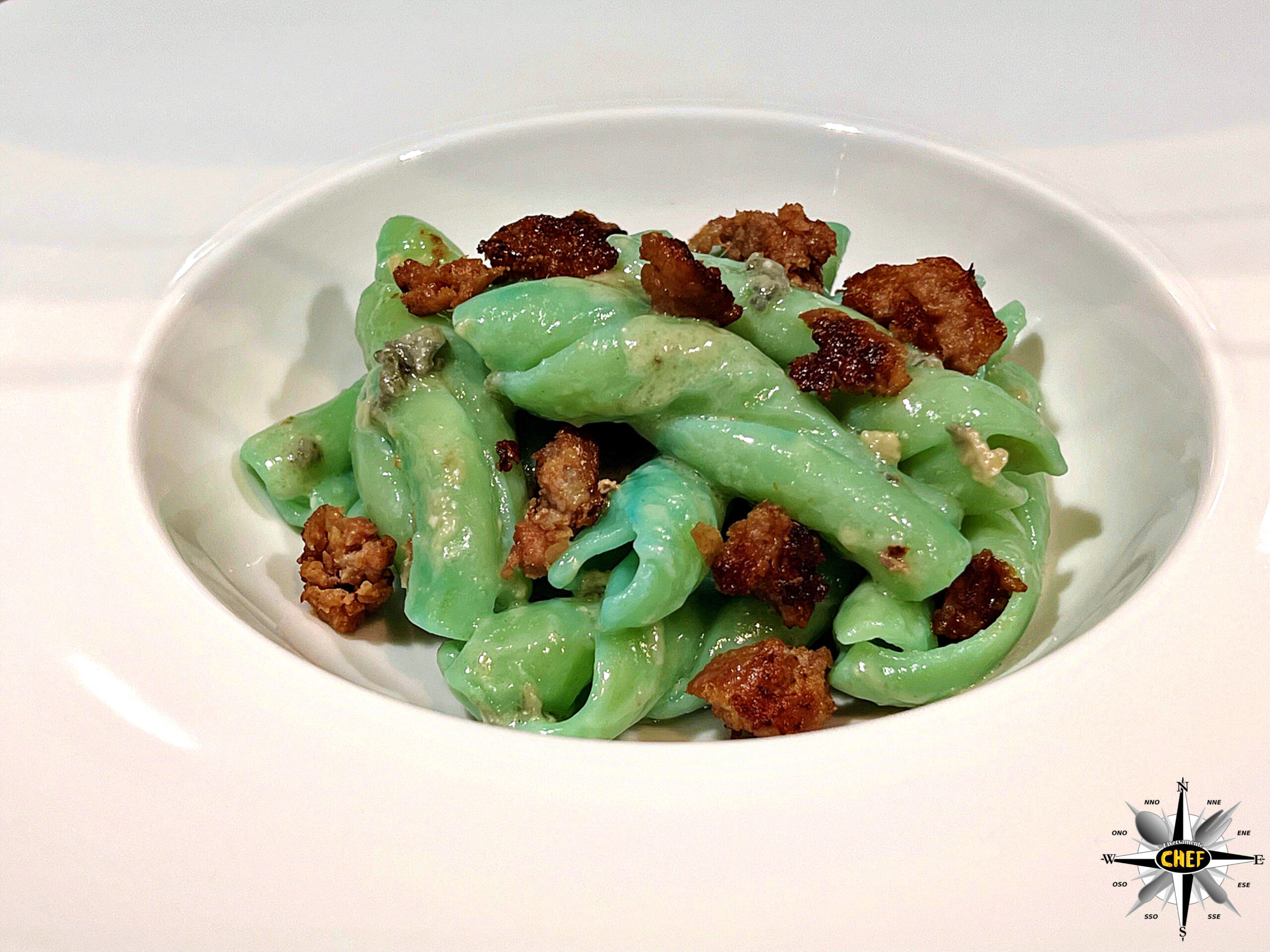 Per i nostri “Treccioni rigati con crema di Bleu de Brebis e Lucanica di Picerno IGP” abbiamo accostato a questo particolare formato di pasta il discusso (ma ottimo) formaggio erborinato francese e la prelibata salsiccia della Basilicata, con una insolita nota di colore assicurata dall’alga spirulina.