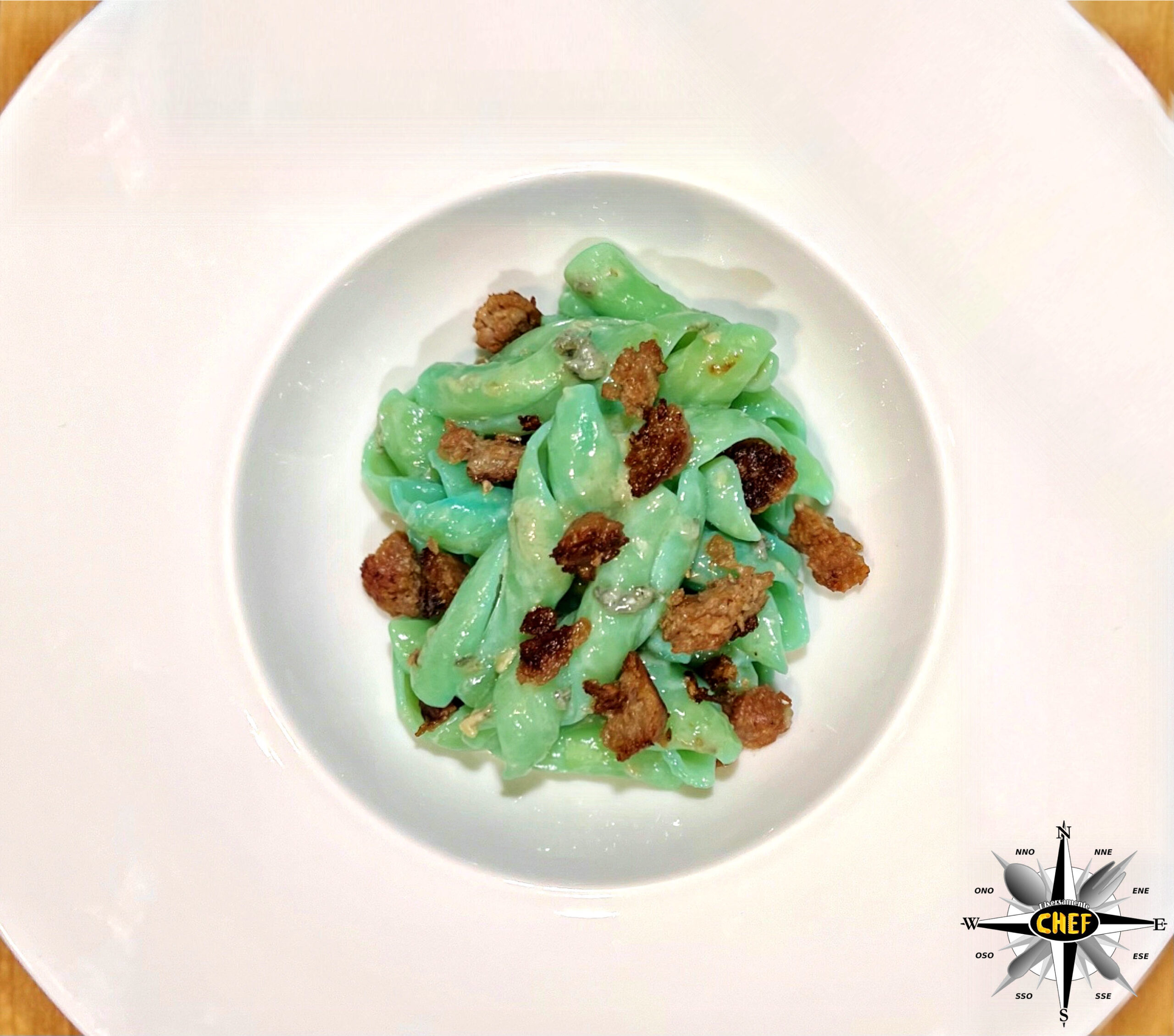 Grazie alla preparazione eseguita con la tecnica della cottura risottata che, abbinata all’alga spirulina in polvere, ha conferito alla pasta la singolare colorazione intonata alla salsa.