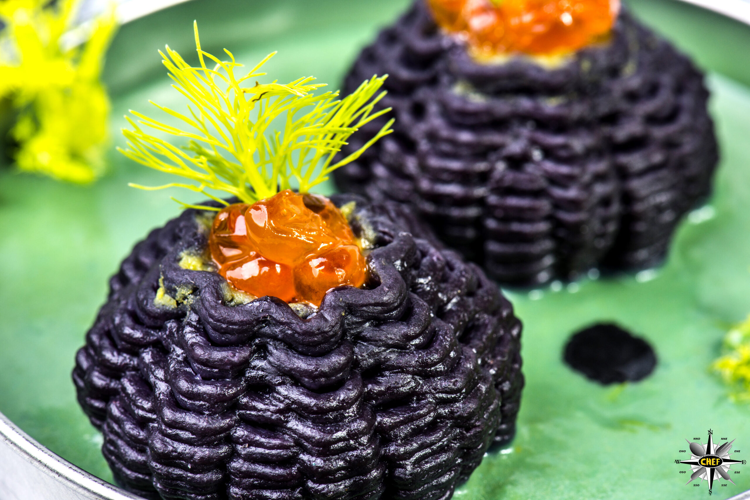 Adagiare due pezzi di pasta Sea Urchin assieme ai germogli di finocchietto selvatico e una goccia di nero di seppia.