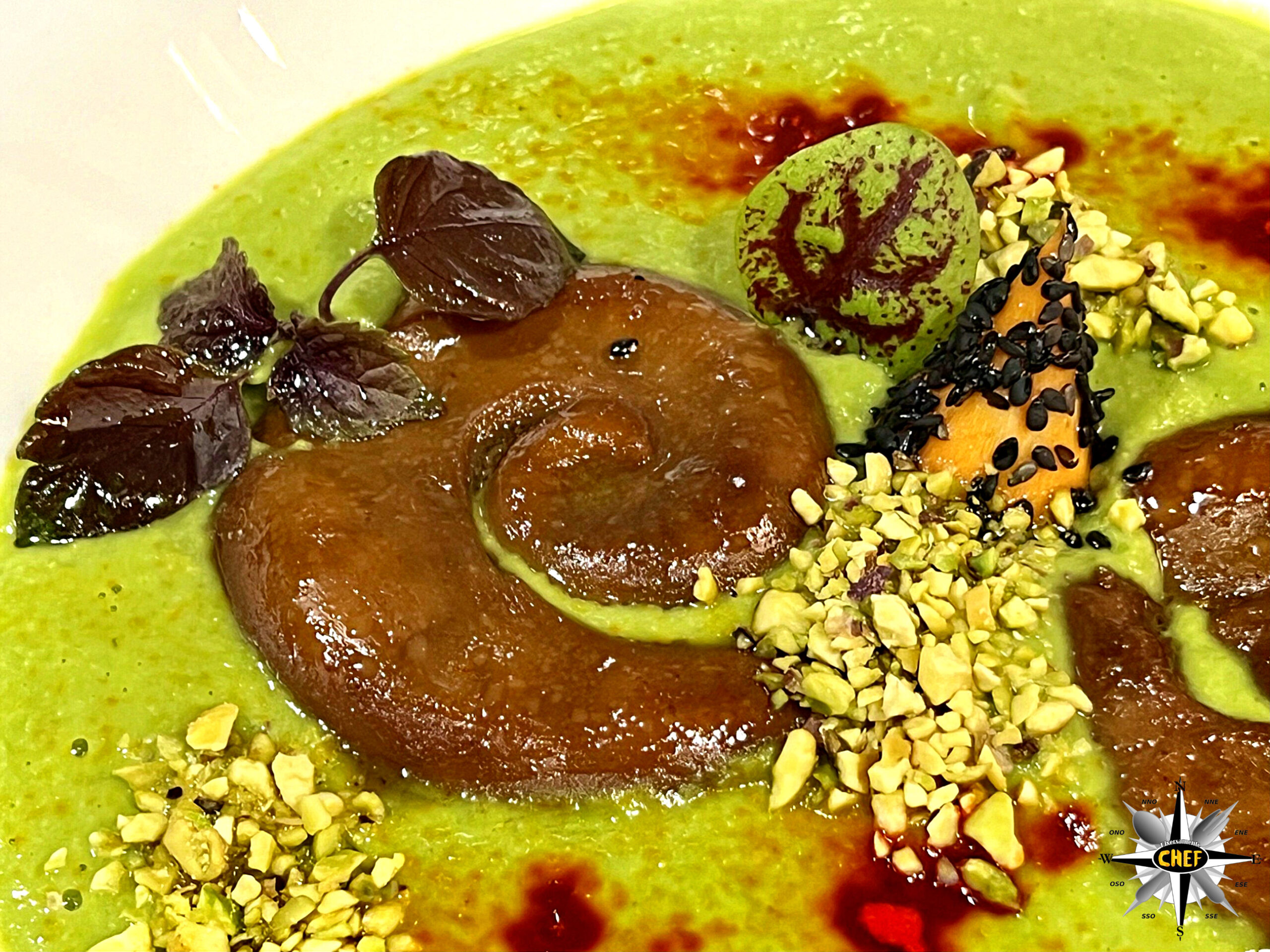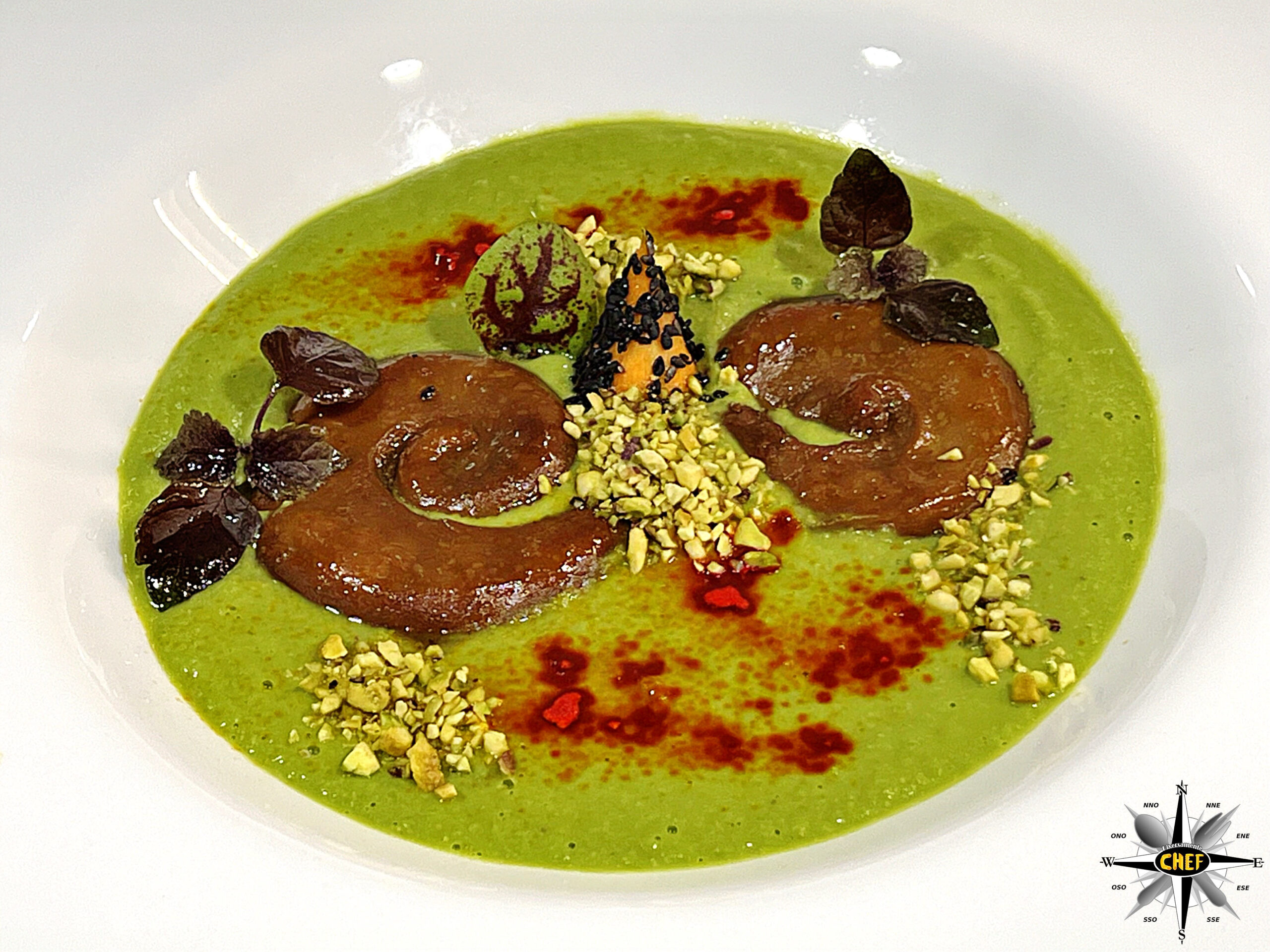 Disporre uno strato di crema di piselli e cazzimperio in un piatto a fondina bianco, adagiando al centro due pezzi di vulva di scrofa leggermente distanziati, inserendo tra loro un pezzo di carota sbollentata, tagliata a cuneo e ricoperta di semi di sesamo.