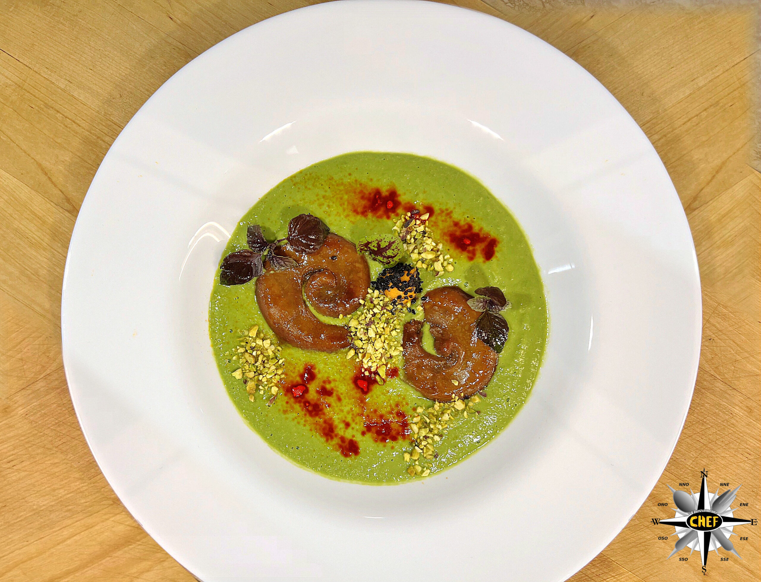 Trasformato per l’occasione in una salsa (a crudo), a base di sedano e finocchio, da mescolare con la crema di piselli, alla quale abbiamo aggiunto anche il peperone verde per esaltare il colore verde dei piselli.