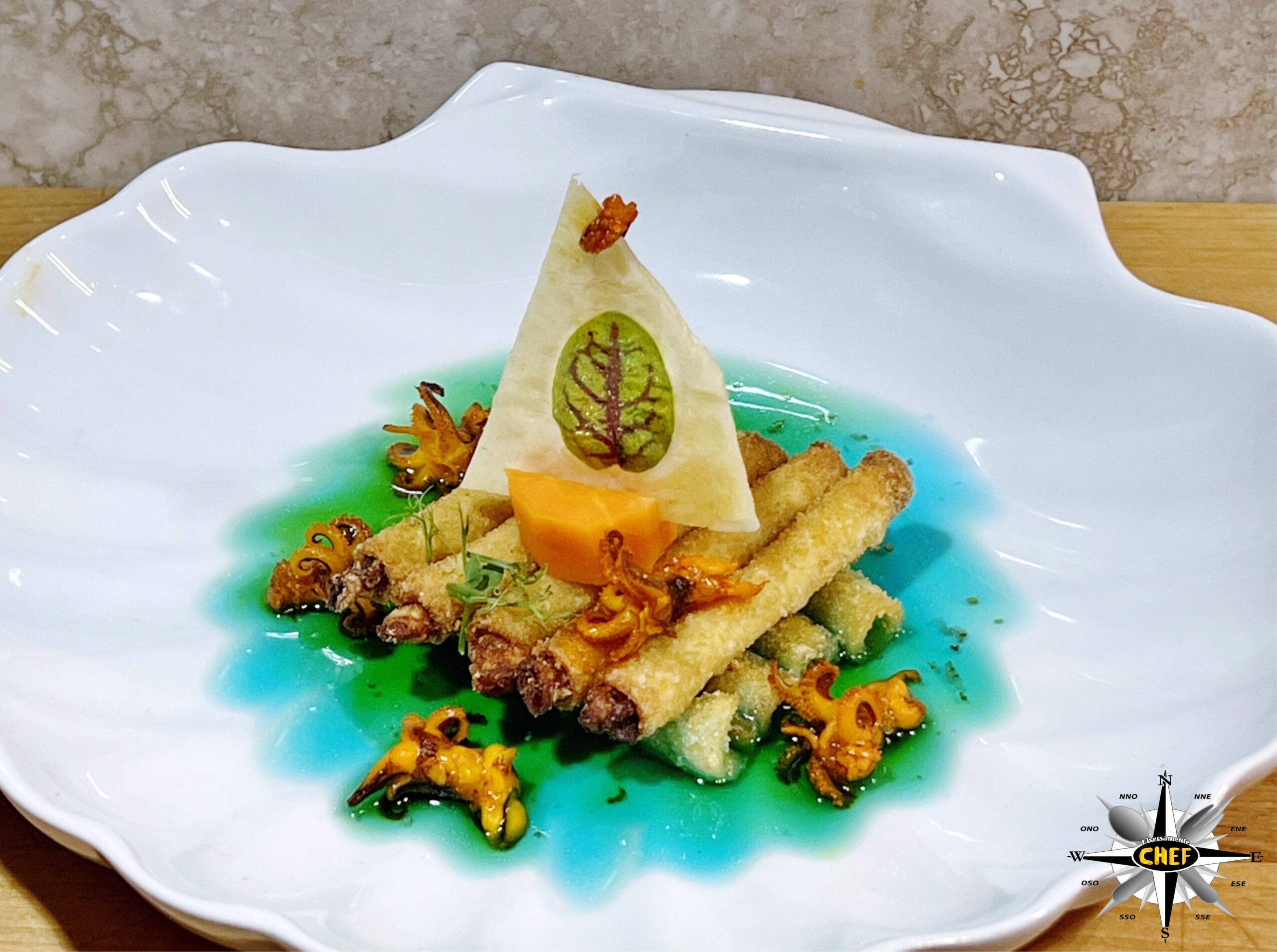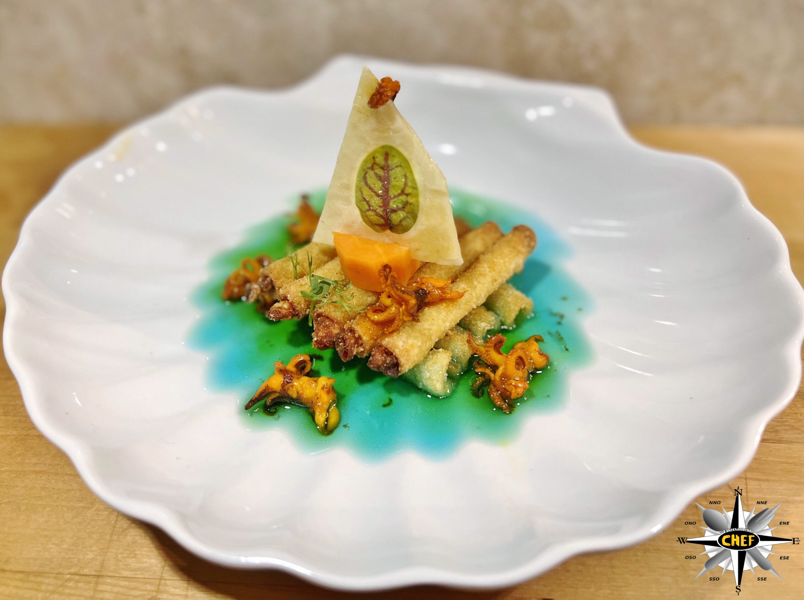 Disporre i moscardini sopra e intorno alla zattera e versare il dashi alla spirulina sul fondo il cui colore originale (blu) virerà nel verde acquamarina nelle aree in cui il dashi viene a contatto con lo zafferano che ricopre i moscardini.