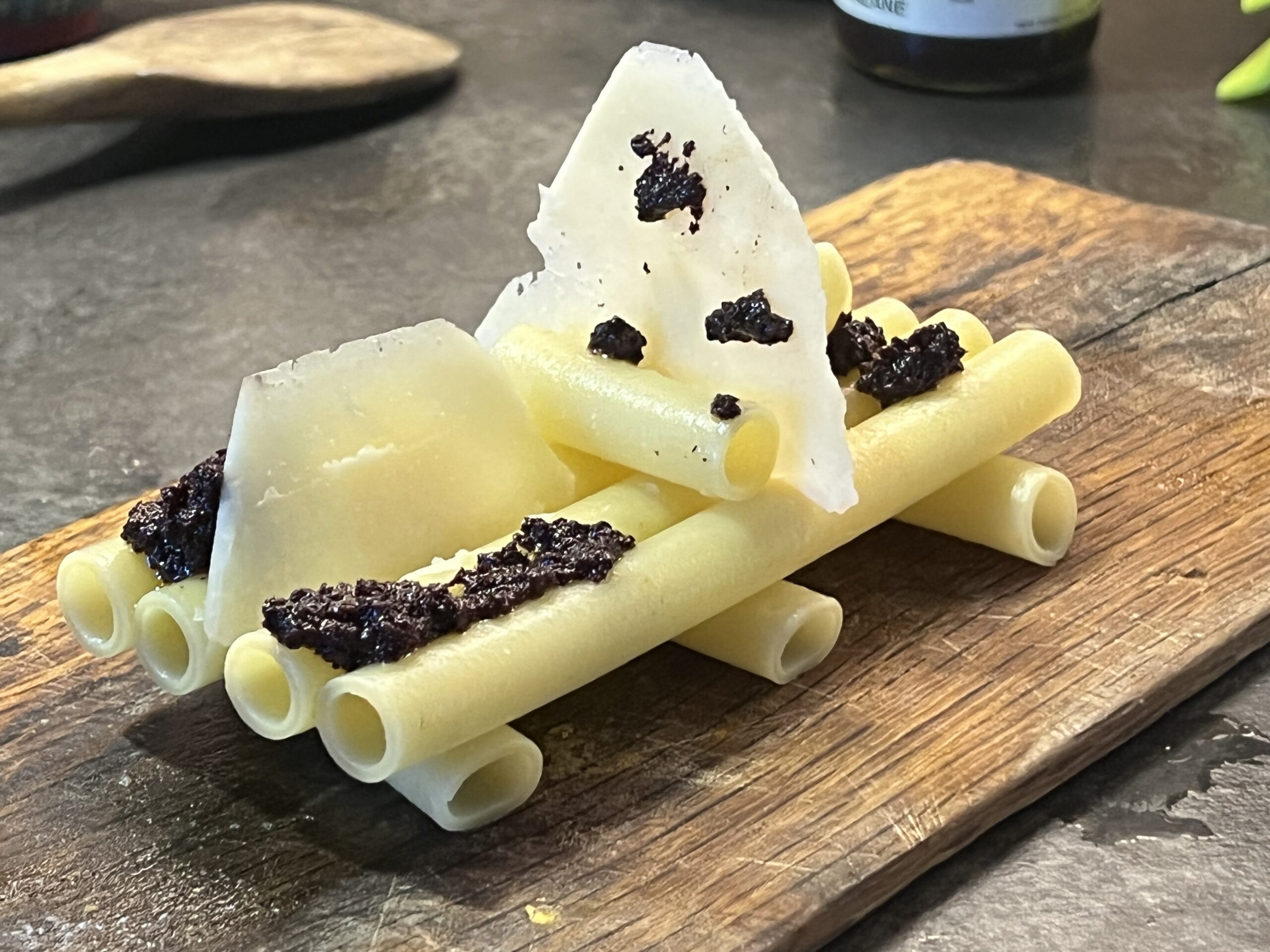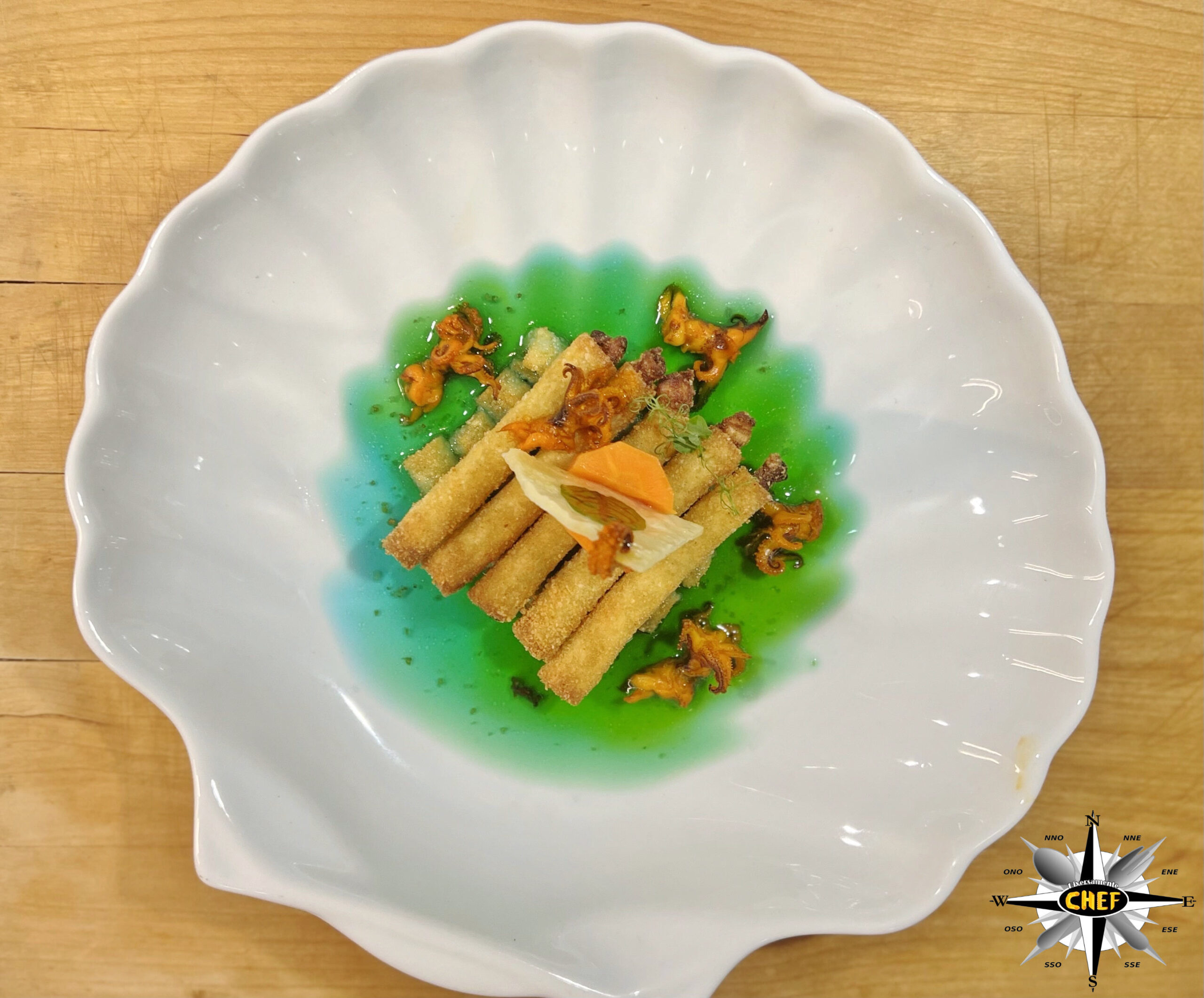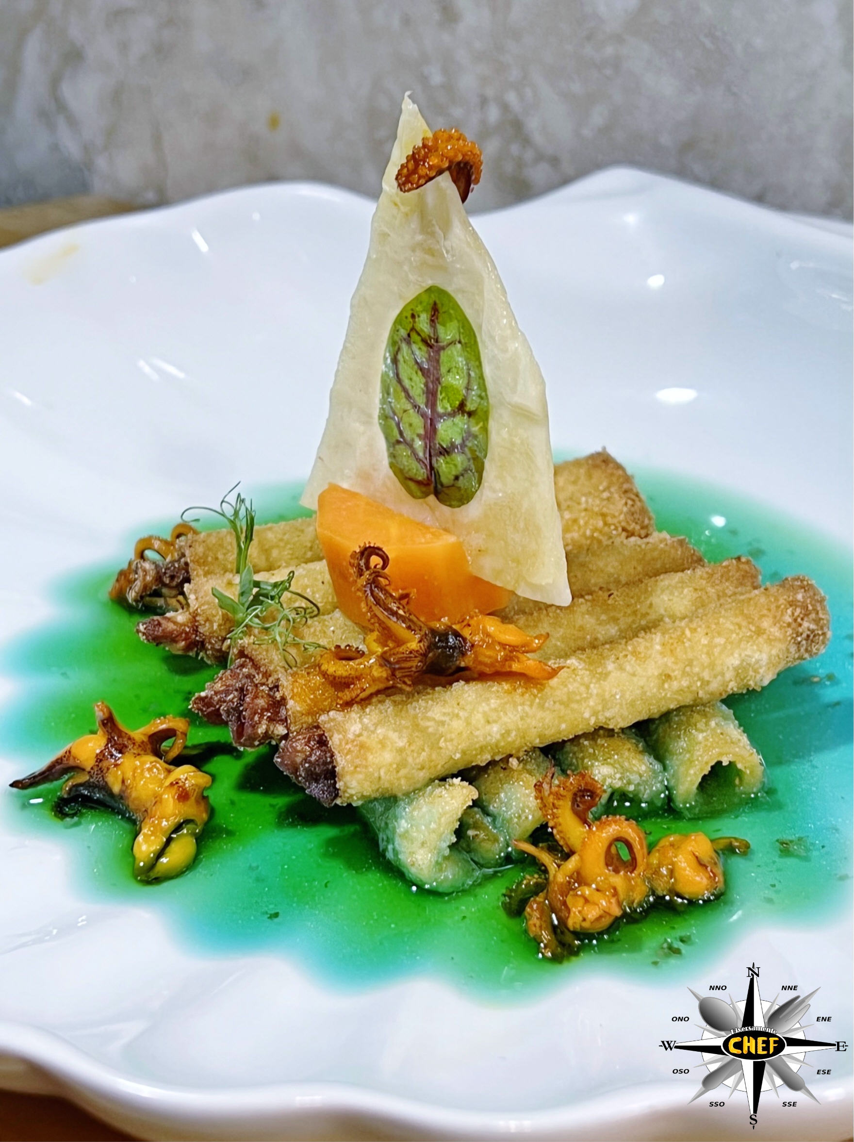 L’aspetto gourmet è sottolineato dal brodo dashi (che assume intense sfumature verdi e acquamarina grazie all’alga spirulina), dalla presenza di moscardini allo zafferano e dai cannolicchi inseriti come ripieno all’interno degli ziti.