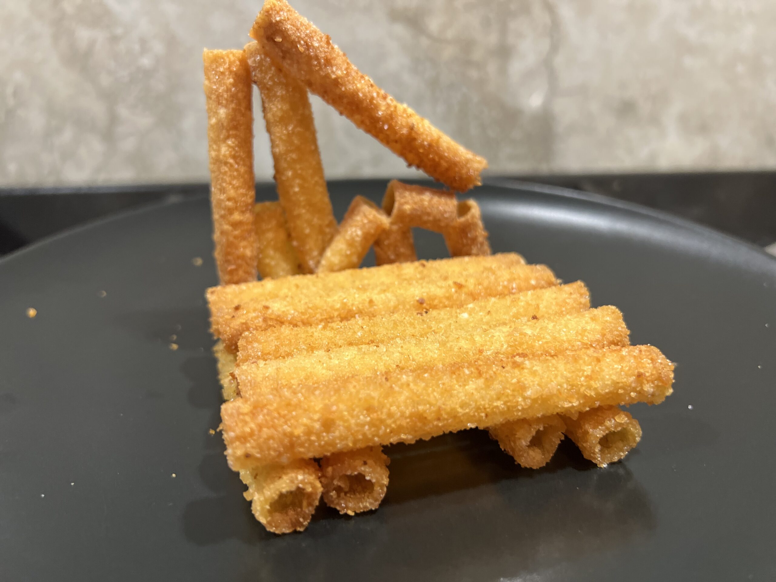 Spezzare gli ziti a metà e cuocere (assieme alla carota) in acqua bollente leggermente salata per 8/10 minuti, dopodiché scolare e raffreddare in acqua e ghiaccio. Tagliare gli ziti nelle dimensioni necessarie a formare la “zattera” e procedere alla seconda fase di cottura. Dopo aver spennellato gli ziti con un pennello intriso di olio, inserire un cannolicchi al loro interno (solo negli ziti della parte superiore) e passarli nella panatura di panko prima di procedere alla frittura (ca 3 minuti per lato). Mettere quindi a scolare gli ziti su un foglio di carta assorbente da cucina.