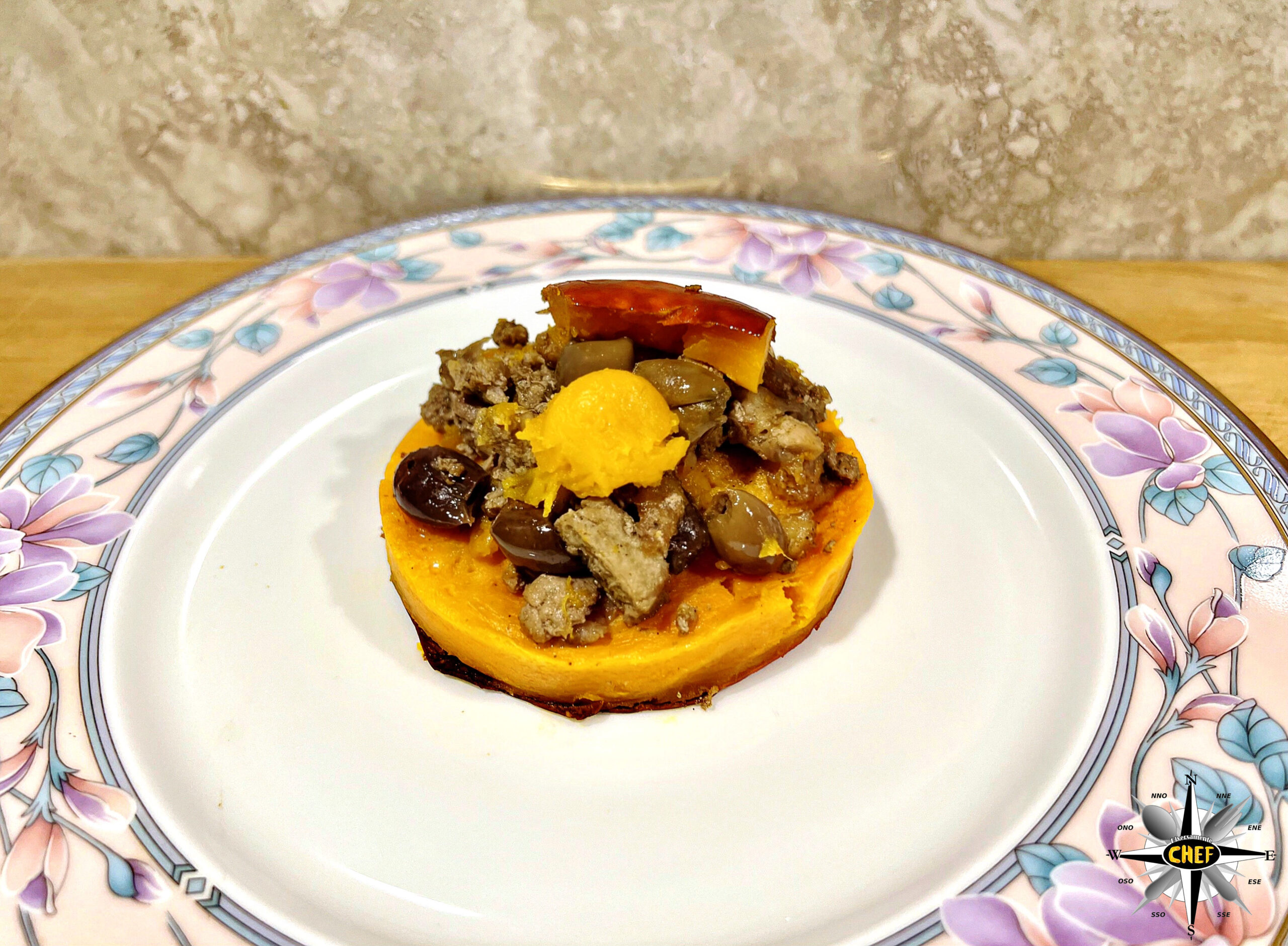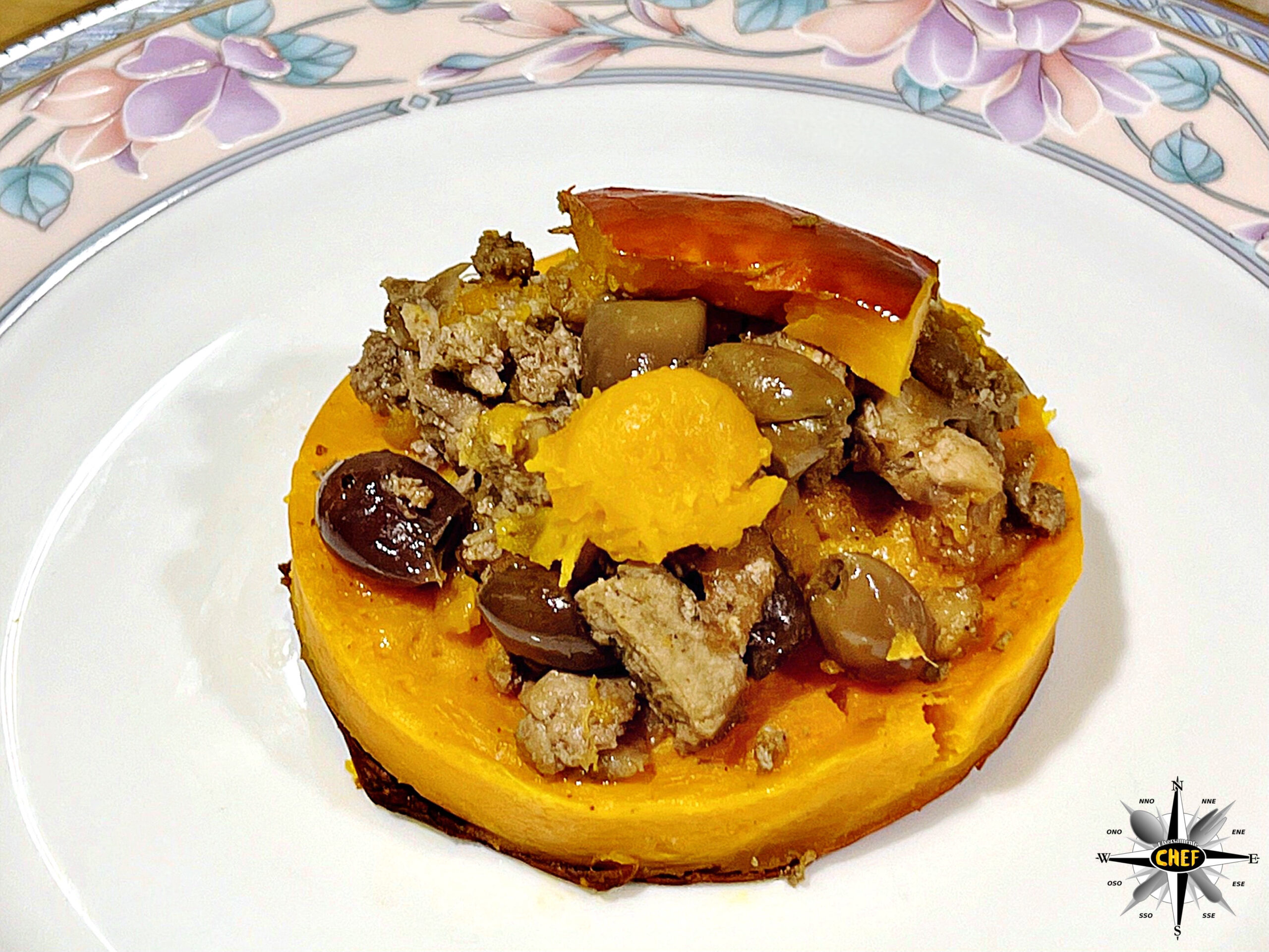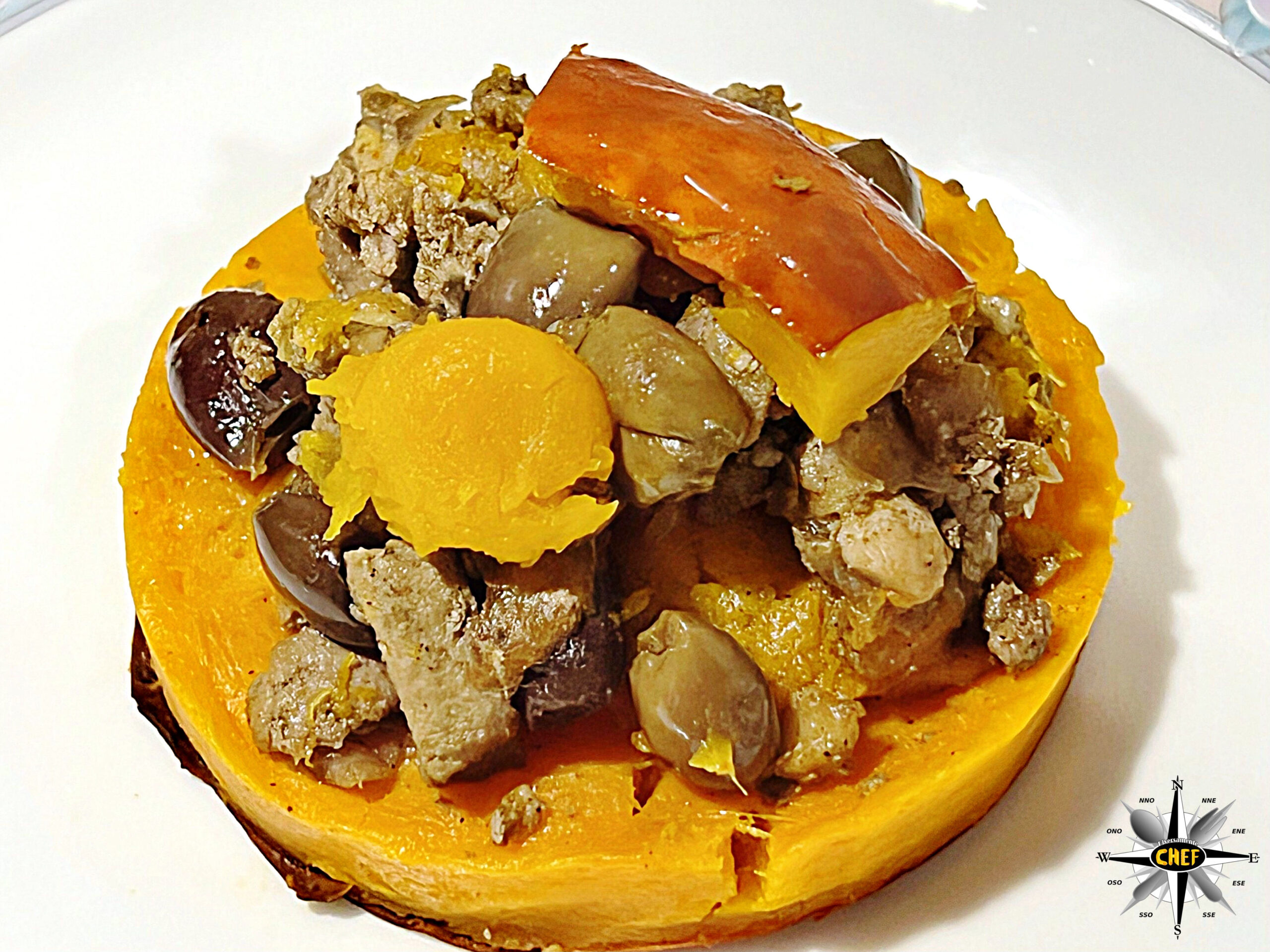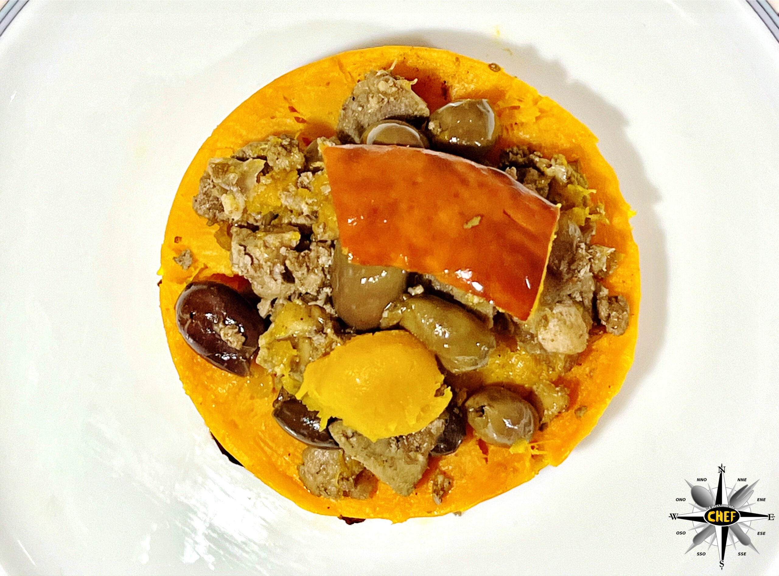 Aggiungere due pezzi di zucca, uno dei quali con la buccia arancione, e la “Zucca Hokkaido con stufato di tritato di Fassona e braciola di maiale” è pronta.